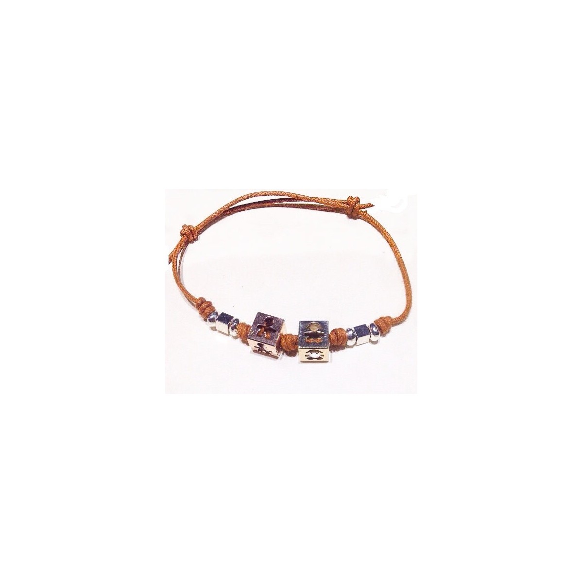Male and female cubes in rosè and white gold (size 0,50 cm) with silver beads, paired up with a small color cord.