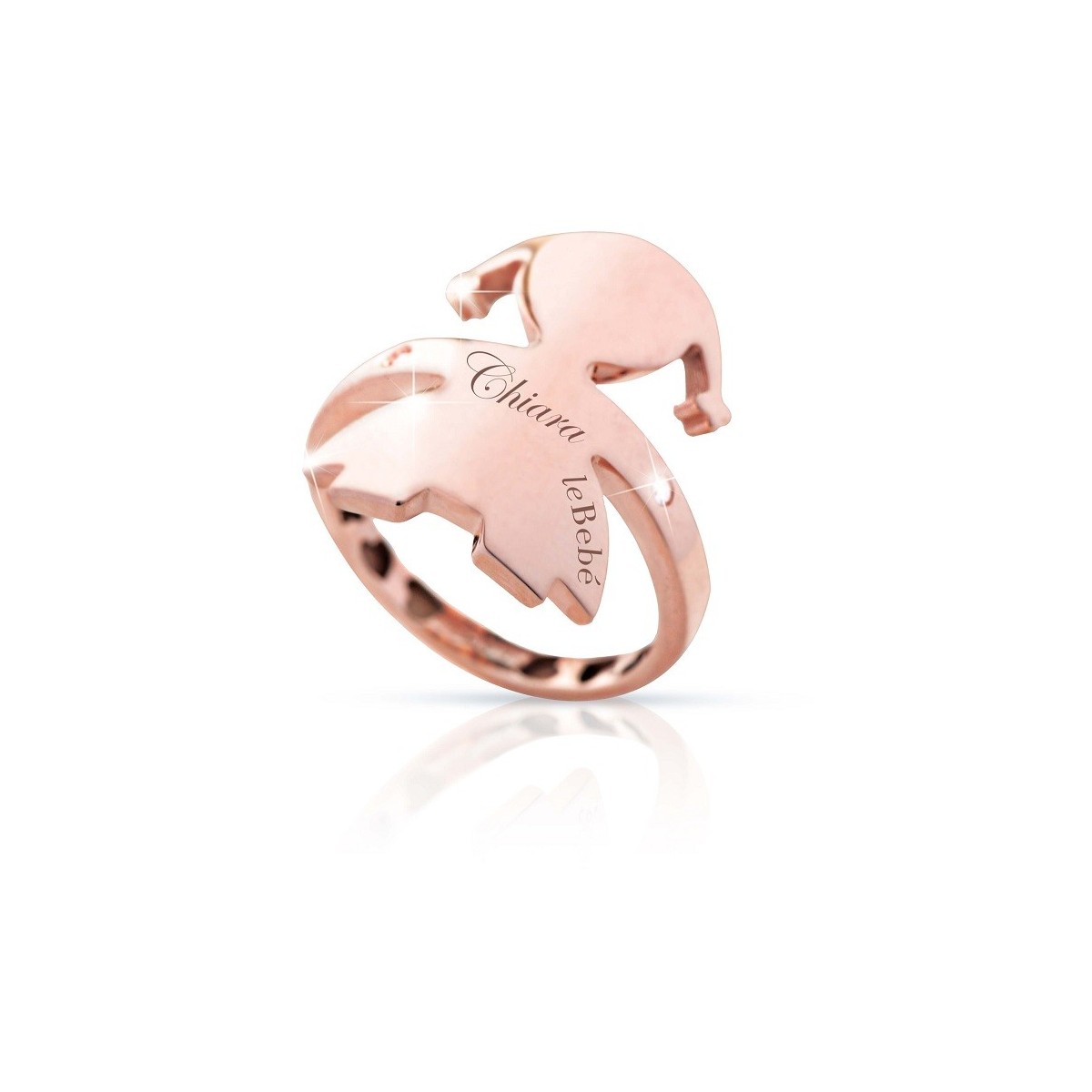 9kt rose gold ring with silhouette girl with two diamonds on the stem and logo