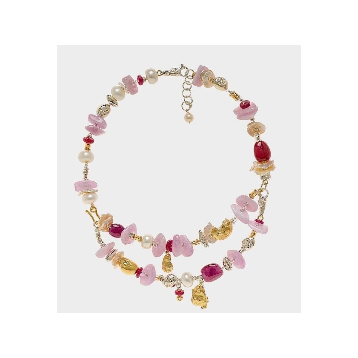 Gold and Silver embellish the Rubies and Kunziti which together with the natural diamond make this necklace unique and inimitable