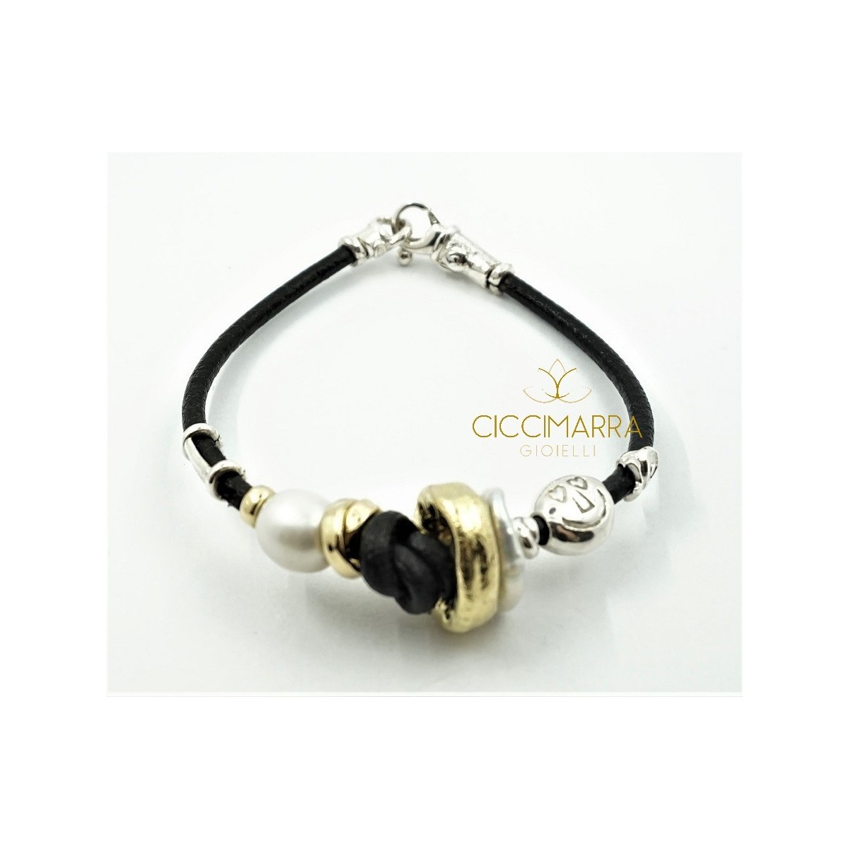 Woman bracelet in knotted leather, Aurora Misani Milano collection with 3 mm Tuscan leather, lobster clasp and hand-worked elements in 18 kt gold, washers and knots, 925 silver and pearl - B2069