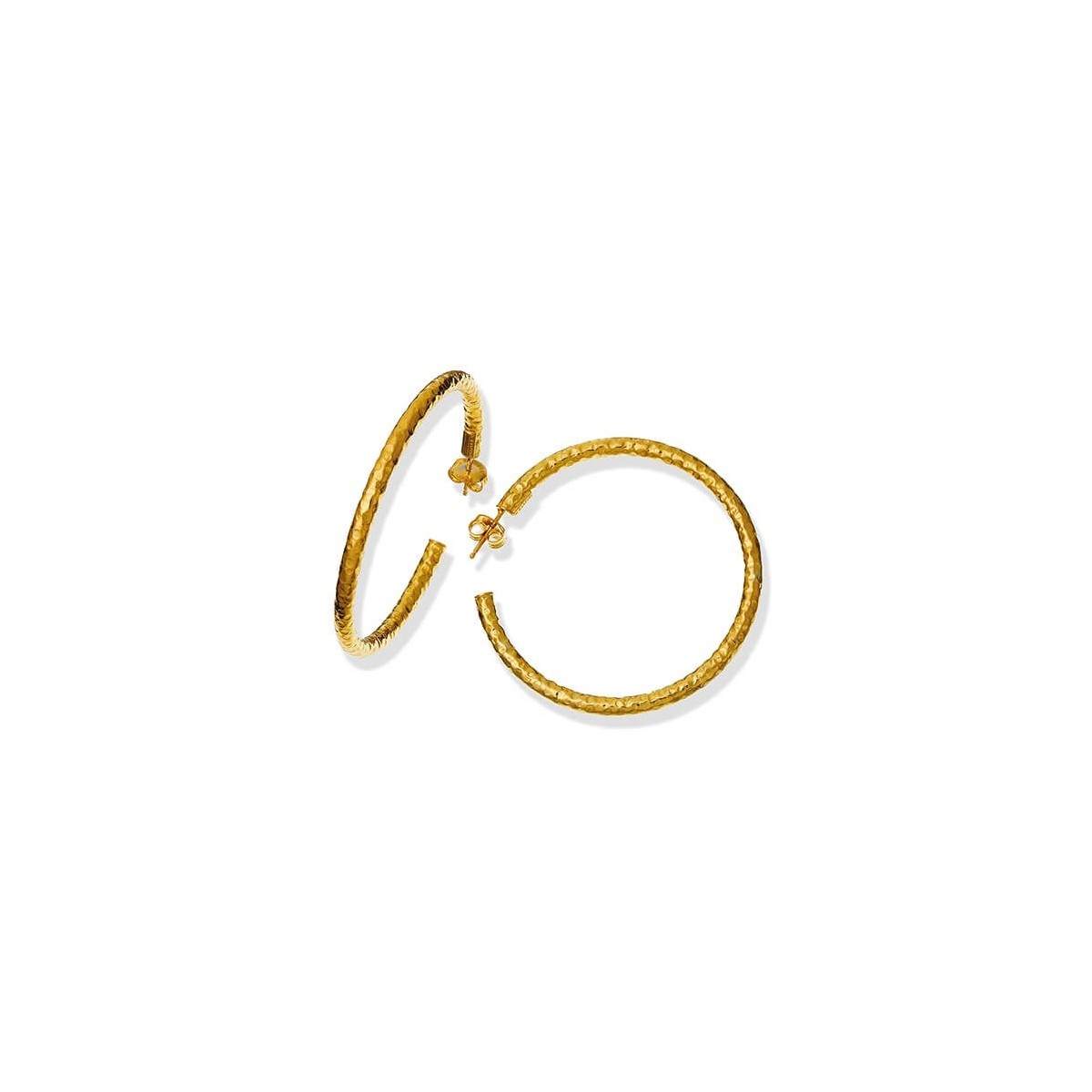 Medium hoop earrings from the Rock collection made of 925 silver and delicate yellow gold plating with hammered pattern and iridescent reflections. Light and full of light jewel suitable for illuminating any face.