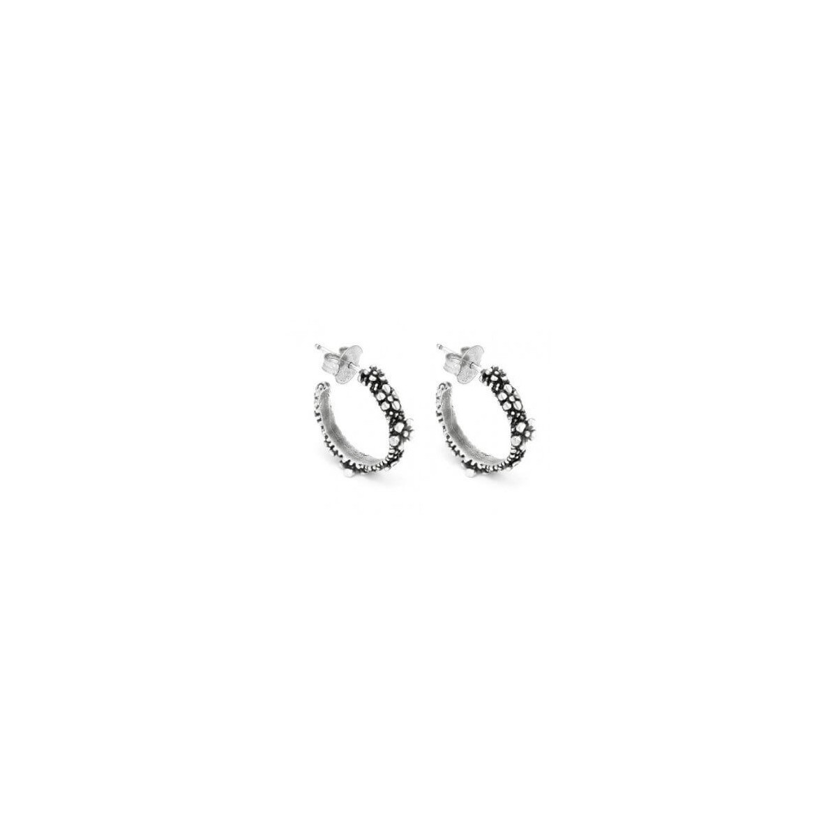 Hoop earrings, from the Millefiori collection, made in 925 silver, made in a circle with elements made by lost wax casting and burnished, here the light is manifested through the diamond-cutting technique, which gives the tiny silver petals a sparkling effect, in contrast with the burnished chain and base. Butterfly closure
