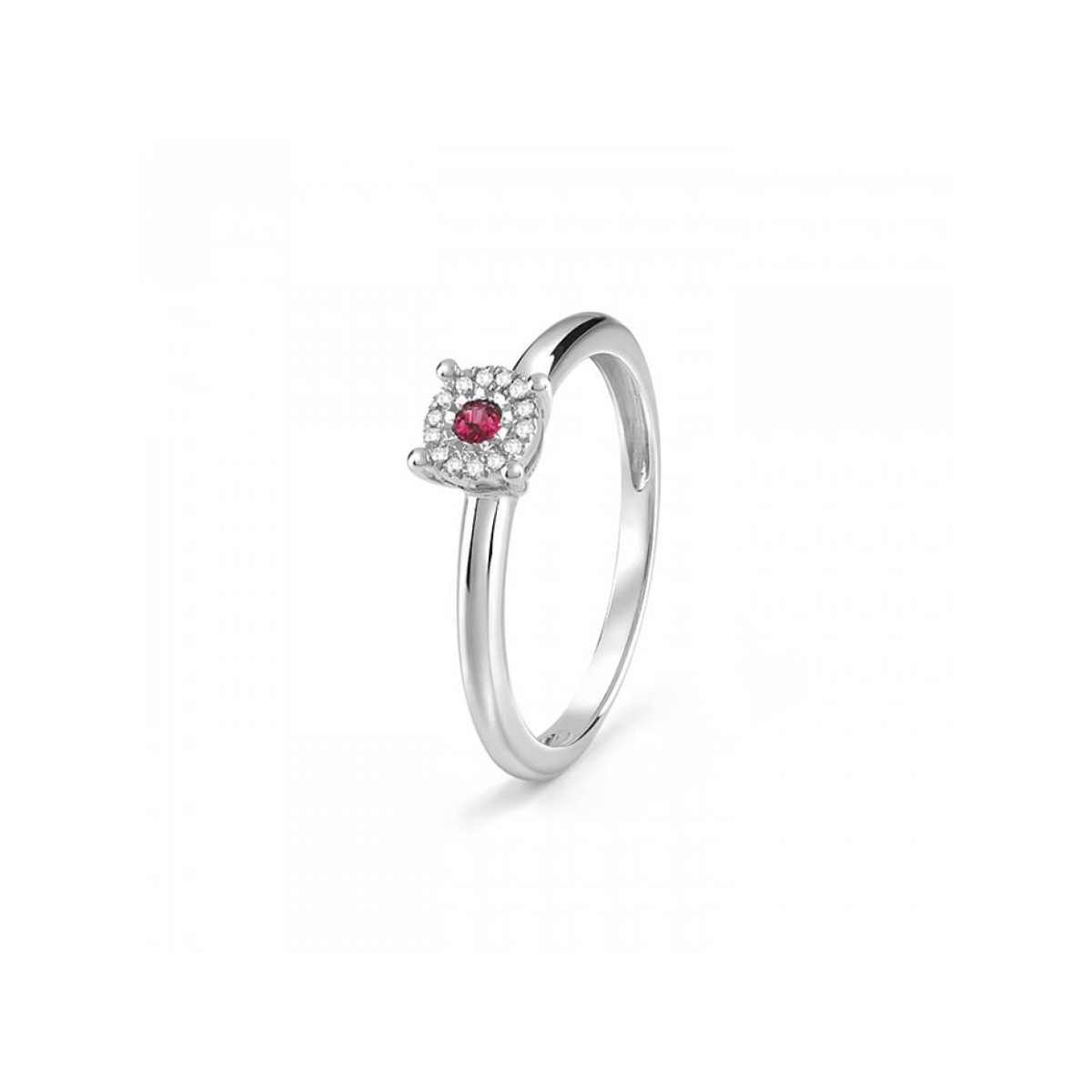 Bliss women's ring from the Rugiada collection made of precious 18 carat white gold with a central 0.06 ct natural ruby framed by a crown of fourteen natural diamonds with a 0.03 carat round brilliant cut.
