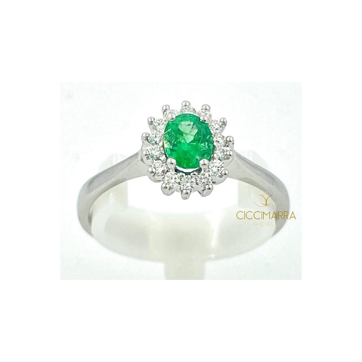 Classic ring of our production in 18kt white gold with central 0.35 carat oval cut Natural Emerald and outline of Brilliant cut Natural Diamonds