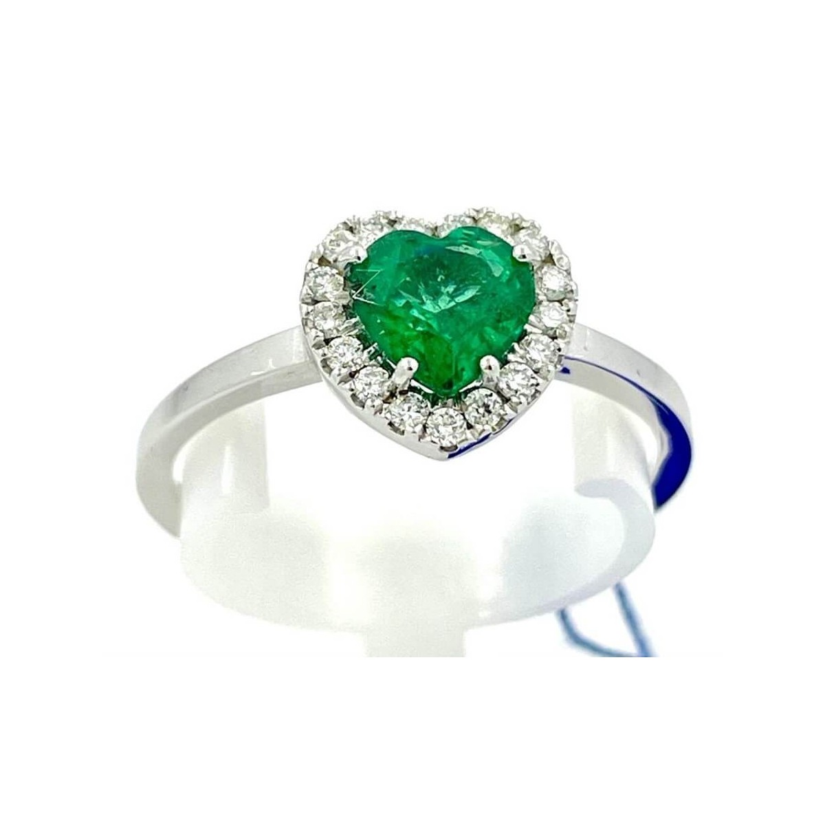 Ring in 18kt white gold with central 0.60 carat Heart cut Natural Emerald and outline of Brilliant cut Natural Diamonds
