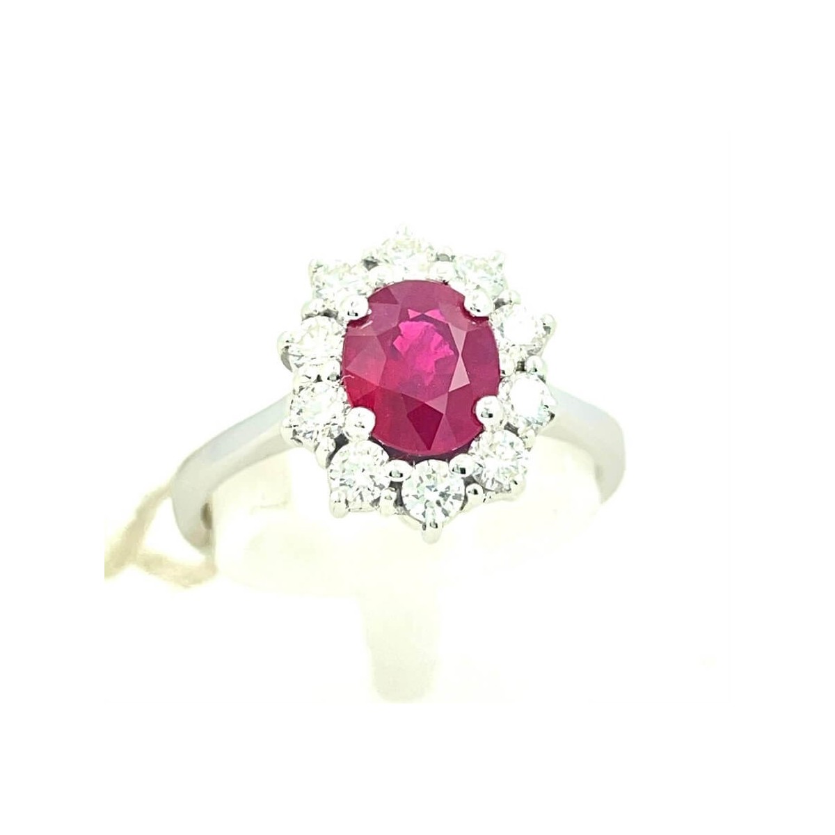 18kt white gold ring with 1.30 carat oval cut Natural Burma red Ruby in the center and a border of Natural Brilliant cut Diamonds