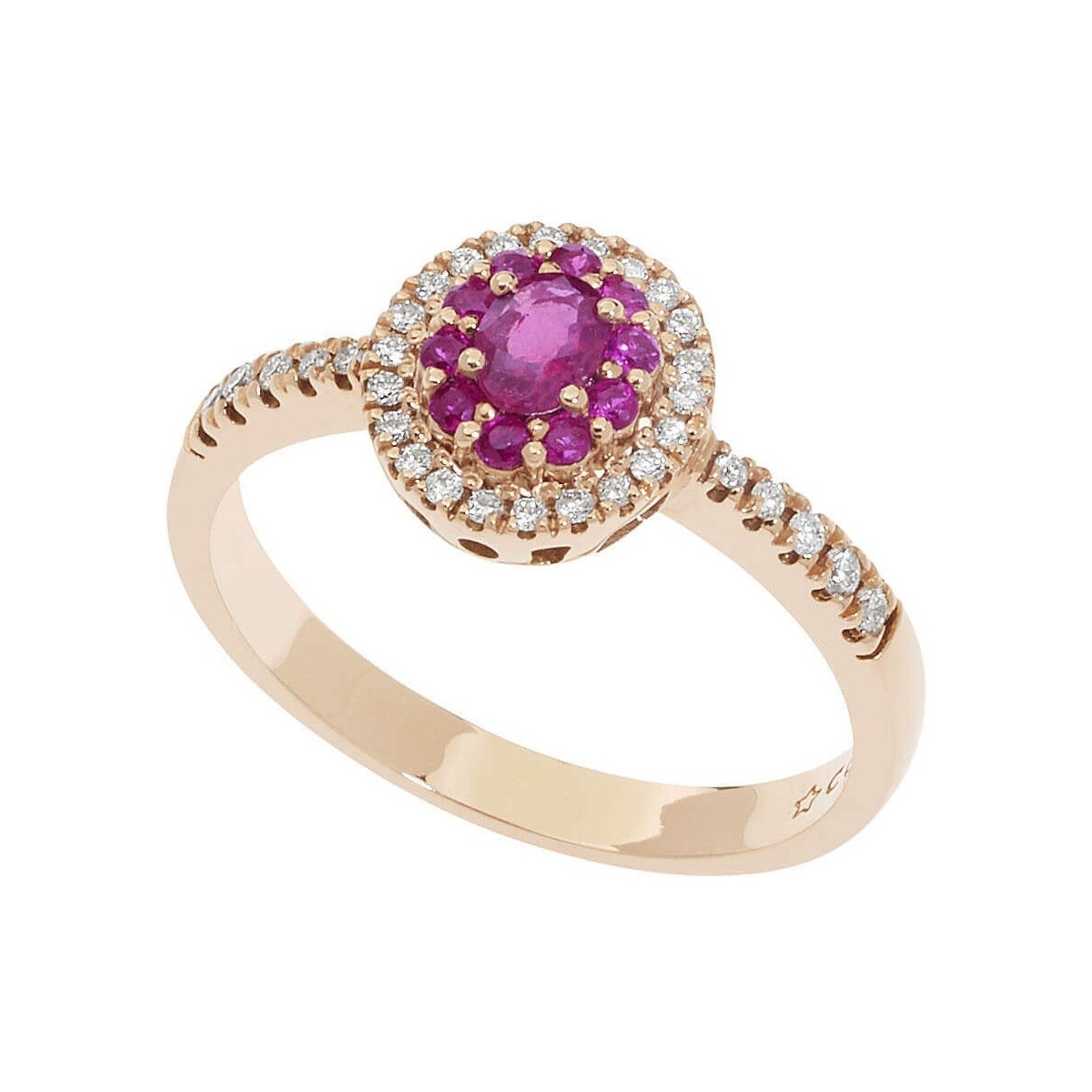 Comete women's ring from the Lilibeth collection made in an elegant 18kt rose gold with 0.39 ct rubies surrounded and embellished with 16ct round brilliant cut diamonds, color G. The ring size is 12