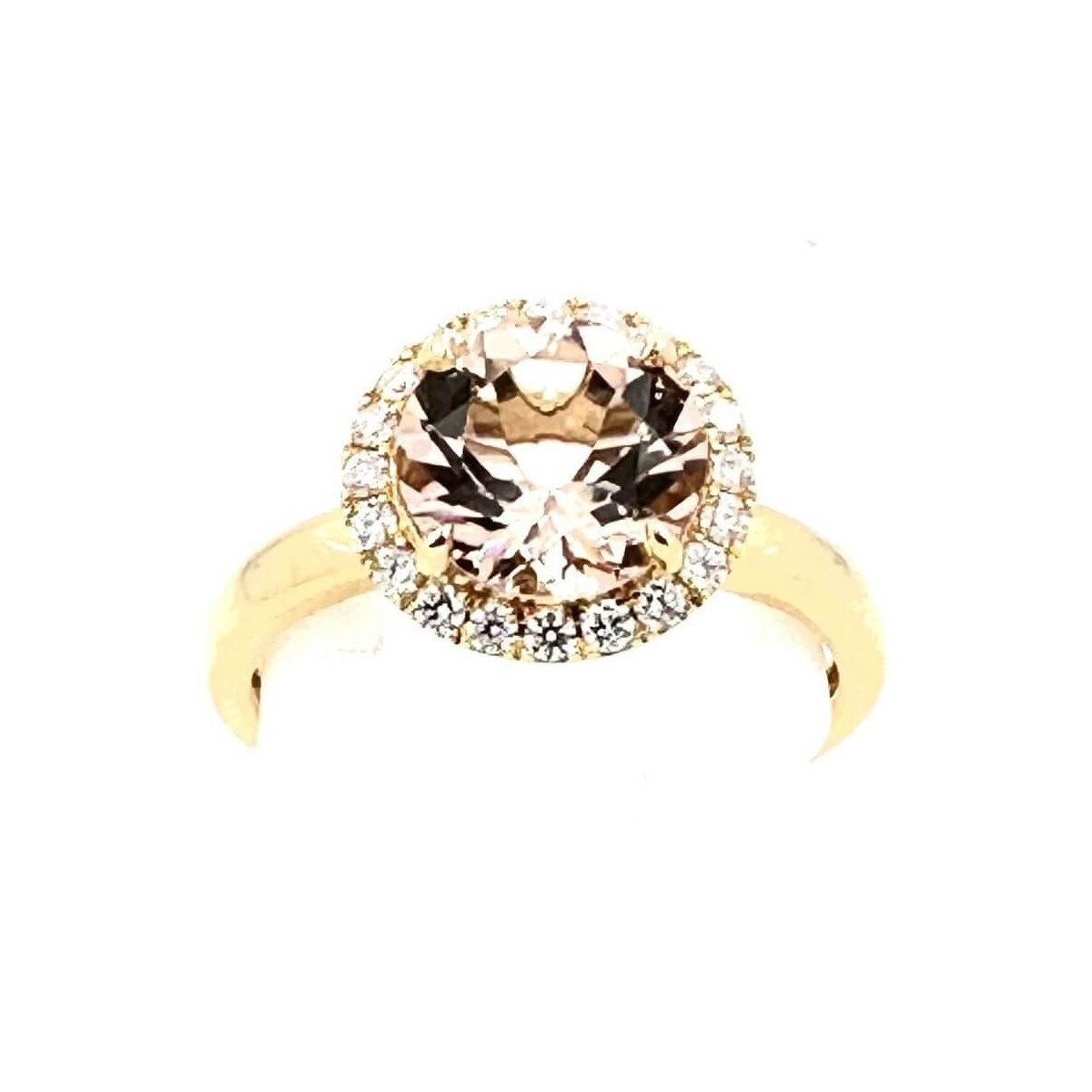18kt rose gold ring with a central round-cut natural pink Morganite and a surround of brilliant-cut natural diamonds.
