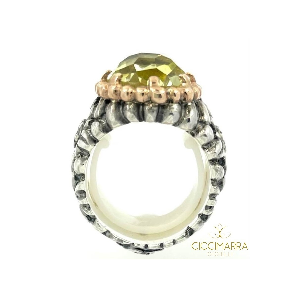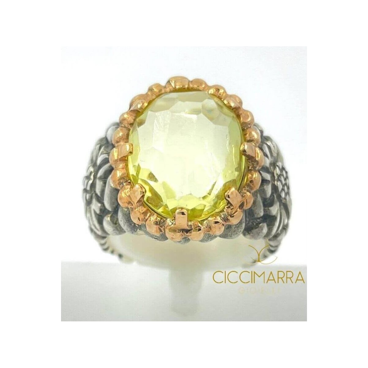 Ring from the Fleurs collection with a 925 silver worked band, rose gold setting surrounding the faceted lemon quartz stone.