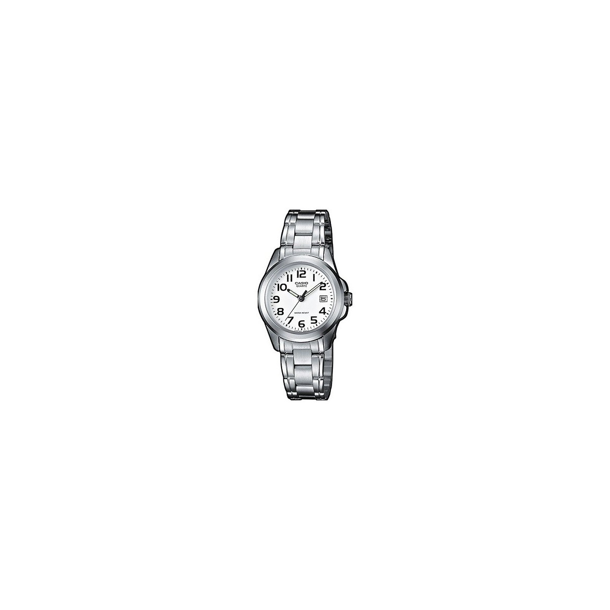 Casio men's watch, from the Casio Collection, with time-only function with quartz day and date. The watch is made with a steel bracelet, 38.4 mm case with mineral glass and white dial with black Arabic indexes and date display at 3 o'clock, hands with fluorescent coating. Deployment clasp