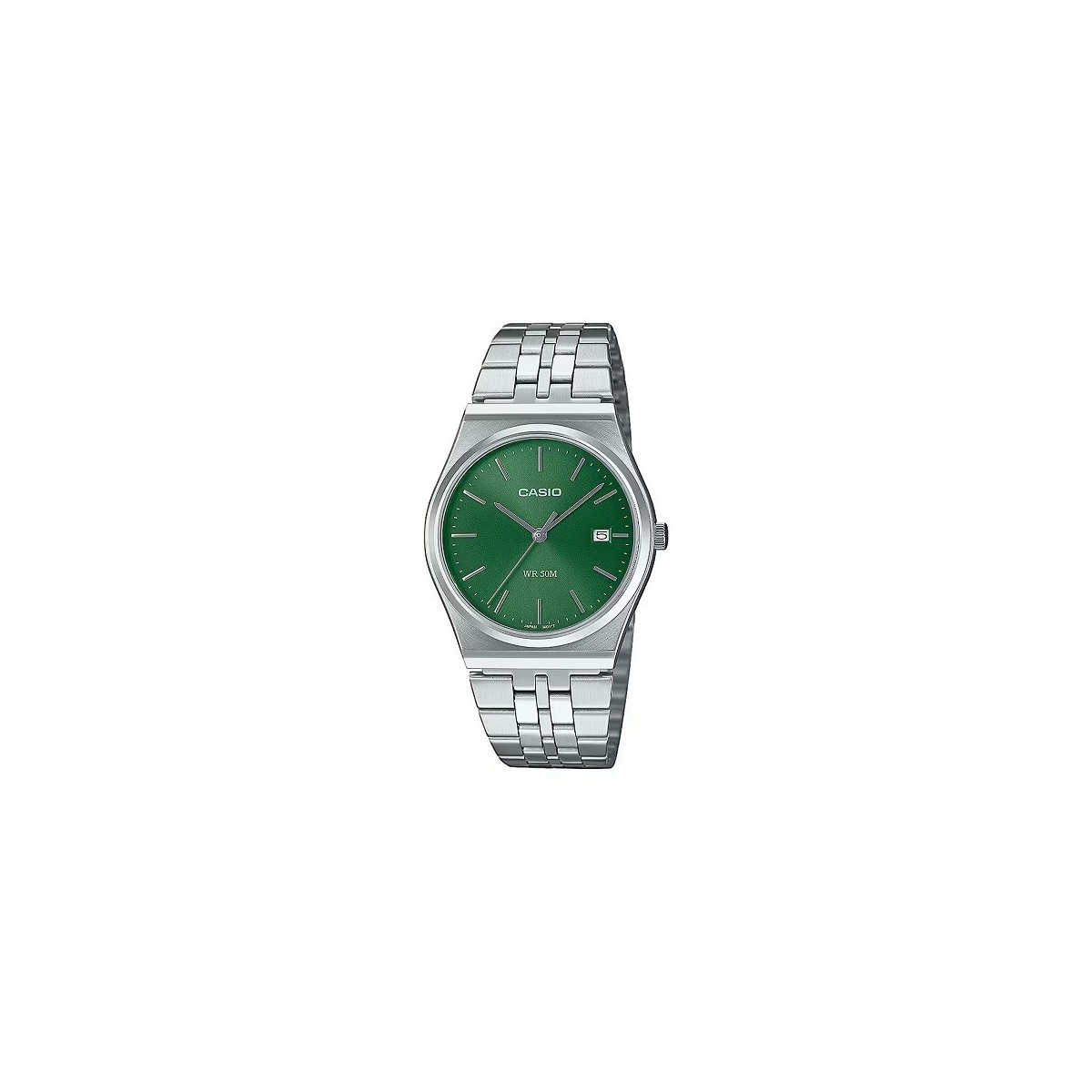 Casio men's watch, from the Casio Collection, with time-only function with quartz day and date. The watch is made with a steel bracelet, 40 mm case with mineral glass and green dial with baton indexes and date display at 3 o'clock. Three-fold one-touch closure.