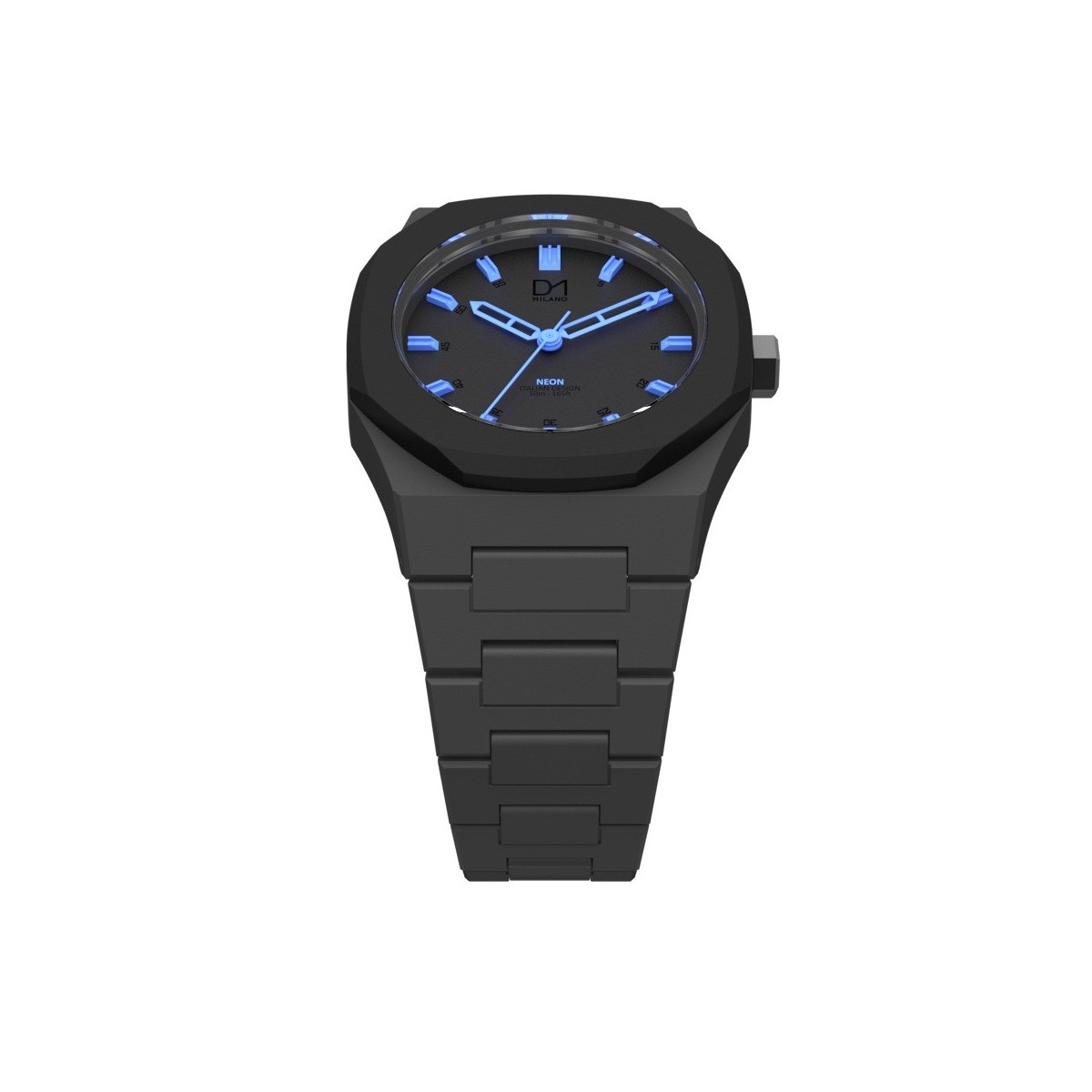 D1 MILAN NEON-case size: 40 MM; -Material: Polycarbonate with Soft-Touch coating applied manually; -Strap: mesh Strap; -Dial: Printed UV; -Glass: Mineral Composite; -Contents: Diamond cut; -Stainless steel 316 L buckle; -Case: stainless steel PVD version available with four screws; -Movement: Miyota only time; -Bezel: Polycarbonate with Soft-Touch coating applied manually