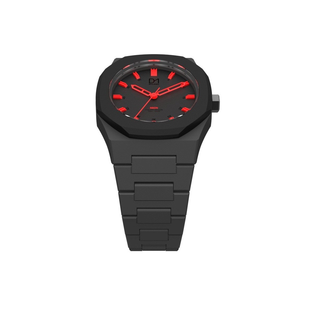 D1 MILAN NEON-case size: 40 MM; -Material: Polycarbonate with Soft-Touch coating applied manually; -Strap: mesh Strap; -Dial: Printed UV; -Glass: Mineral Composite; -Contents: Diamond cut; -Stainless steel 316 L buckle; -Case: stainless steel PVD version available with four screws; -Movement: Miyota only time; -Bezel: Polycarbonate with Soft-Touch coating applied manually