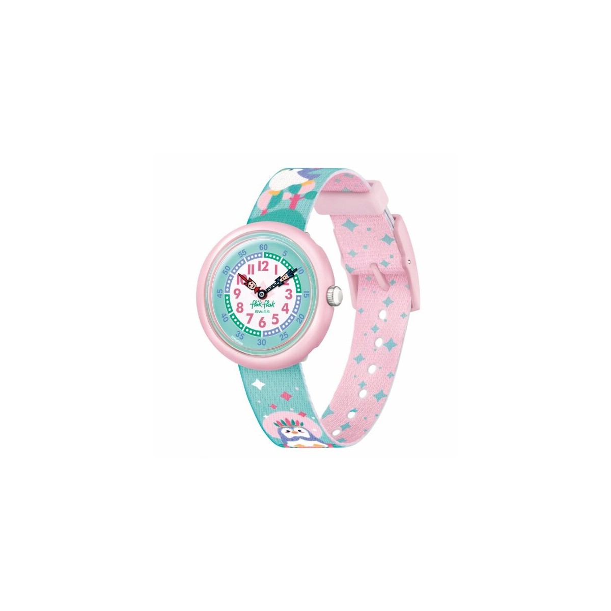 Learning the time with Flik Flak has never been so easy and fun. This watch from the Brrrave Pinguins collection for kids is made with a teal recycled PET fabric strap with penguin motif, has a 32 mm pink case in bio-based plastic, two-tone teal and white dial with blue and pink hands. Time only function and quartz movement.