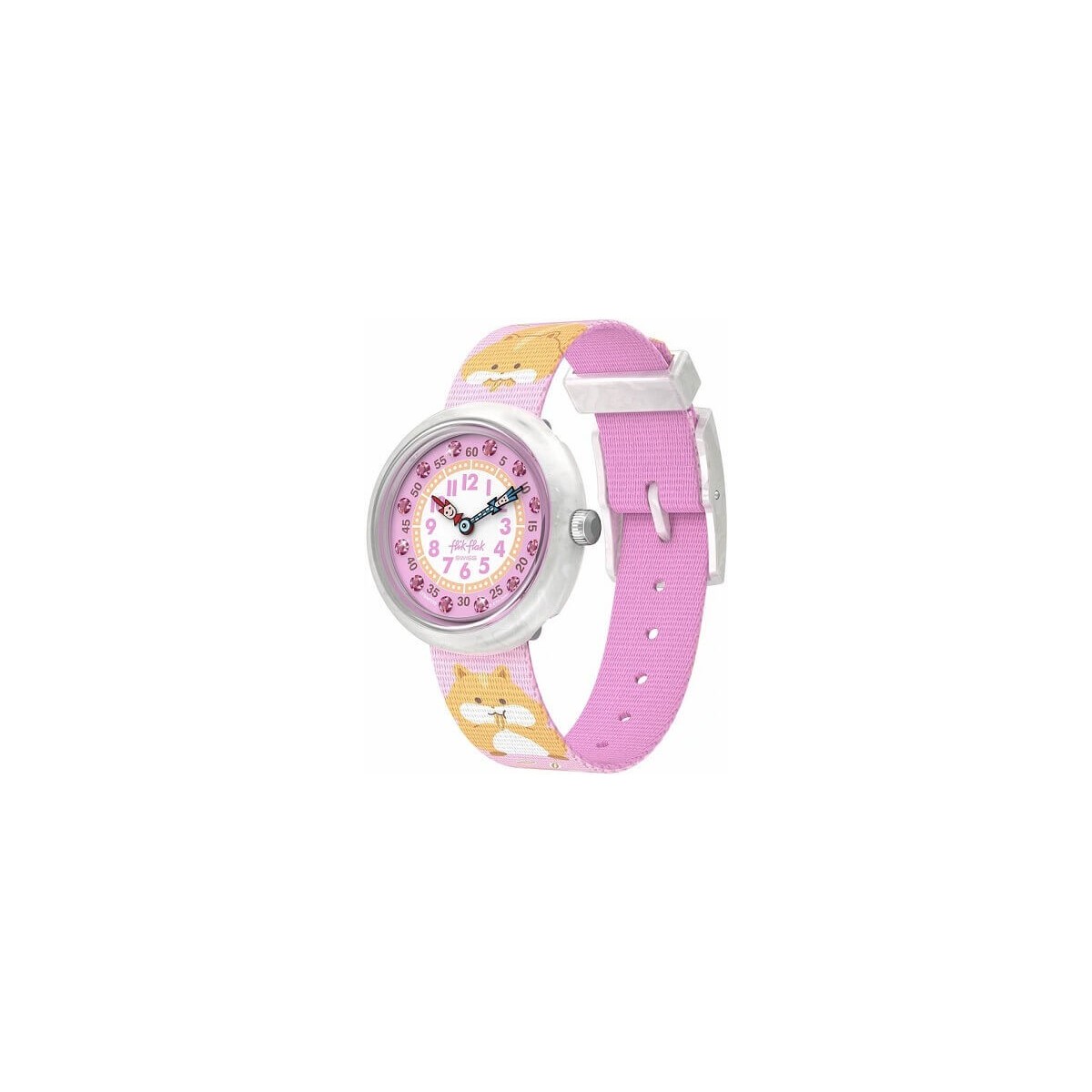 Learning the time with Flik Flak has never been so easy and fun. This watch from the Cuddly Hamste collection for kids is made with a pink recycled PET fabric strap, has a transparent 32 mm bio-based plastic case, a pink dial with pink and blue hands embellished with crystals. It has a time-only function and quartz movement.