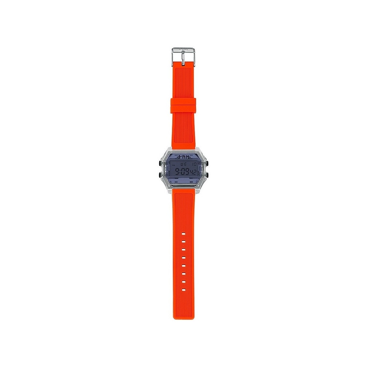 IAMTHEWATCH digital watch with gray transparent polycarbonate case with blue glass and orange silicone strap with steel buckle.