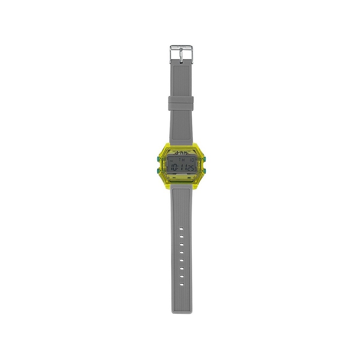 IAMTHEWATCH digital watch with transparent effect yellow polycarbonate case with gray colored glass and dark gray silicone strap with steel buckle.