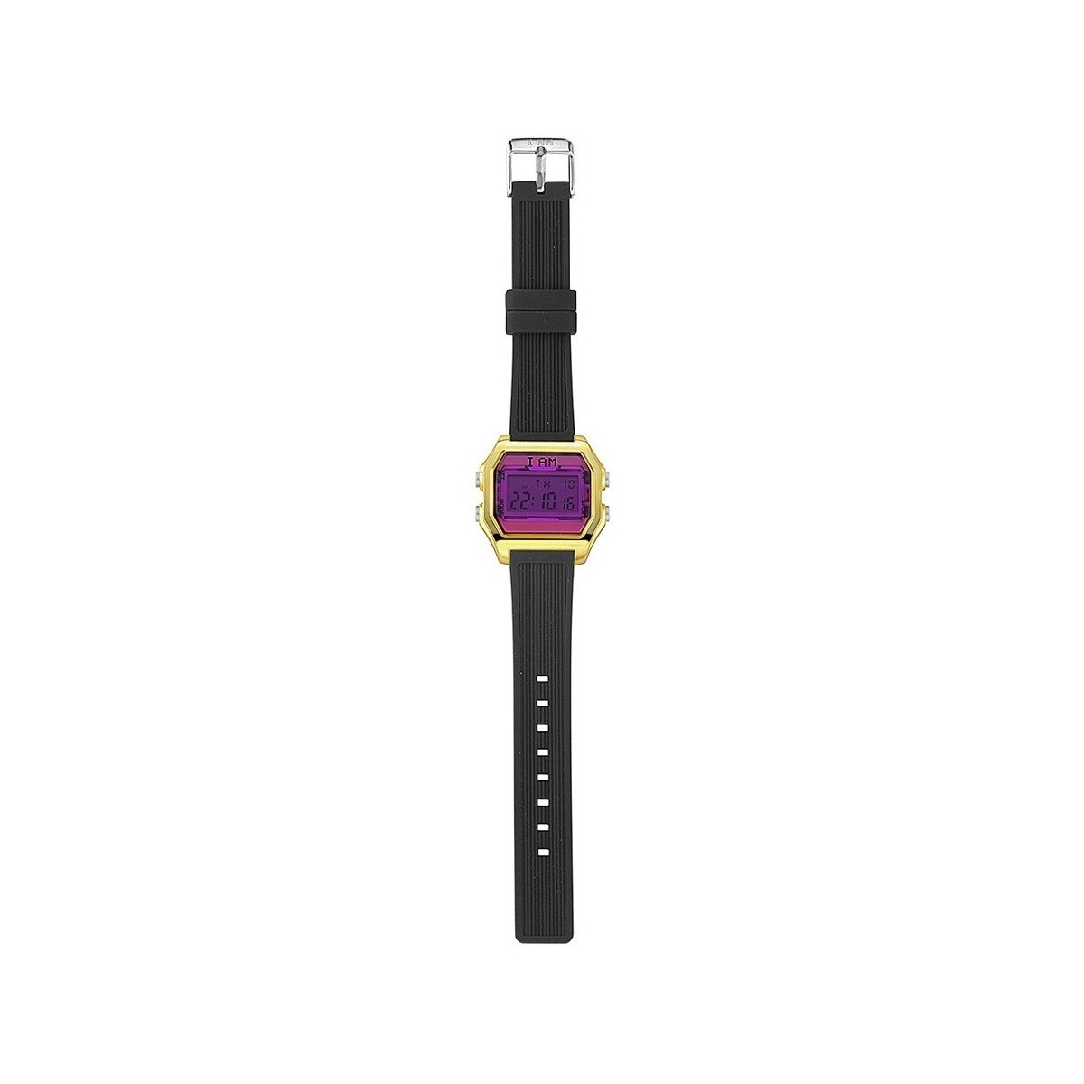 I AM Women's digital watch with gold-colored polycarbonate case with fuchsia glass and black silicone strap with steel buckle.
