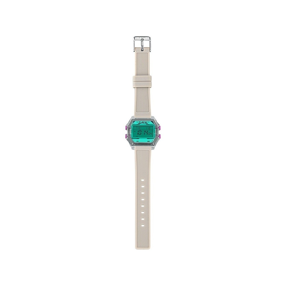 I AM Women's digital watch with gray transparent polycarbonate case with teal glass and gray silicone strap with steel buckle.