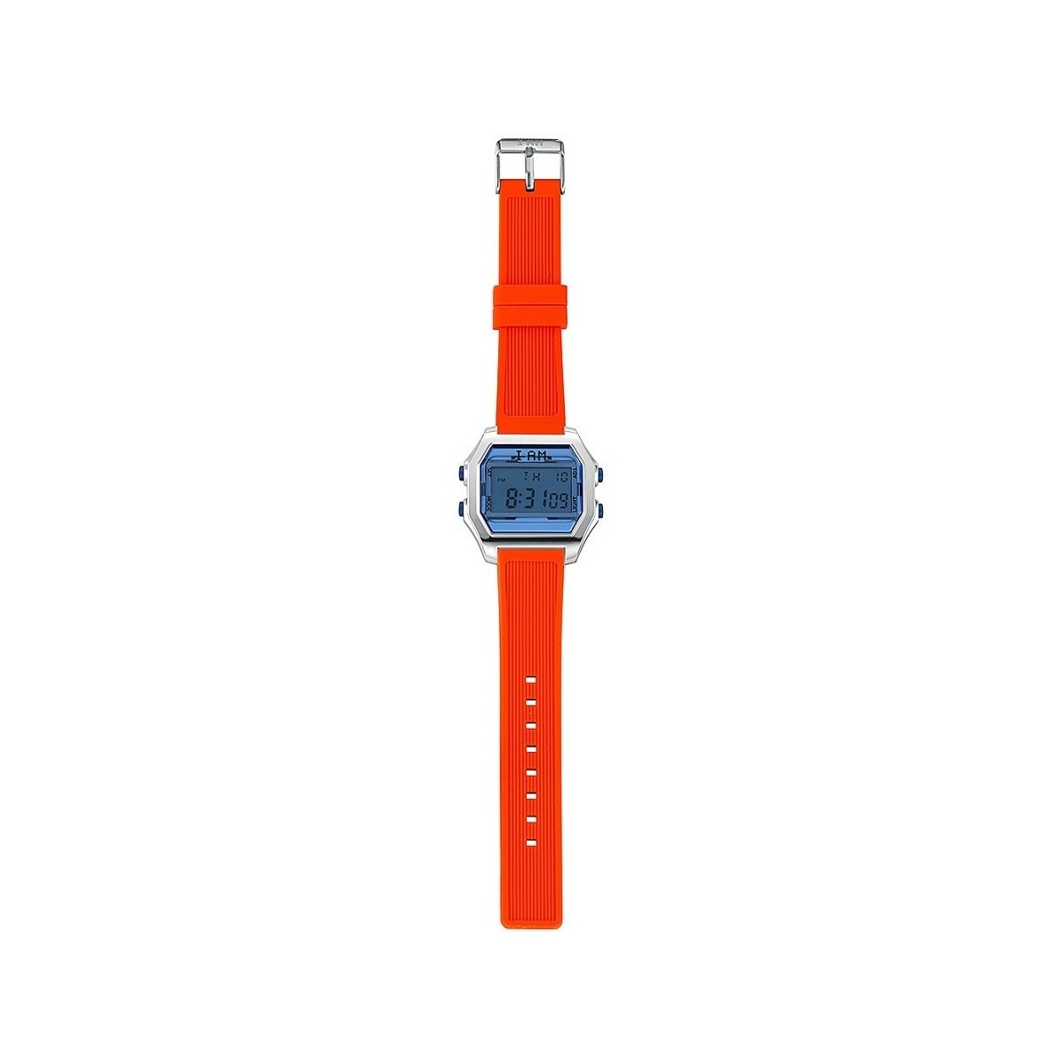 I AM men's digital watch with silver-colored metal-effect polycarbonate case with dark blue glass and orange silicone strap with steel buckle. Functions: Month, Date, Morning / Afternoon, Light, Ringtone, Stopwatch, Time Signal, 12/24 Hour Schedule. Water Resistance Is 5 Atm. Clock Equipped with J8519 Digital Movement. Watch Composed From Cash Ref. IAM-105 E Strap Ref. IAM-308.