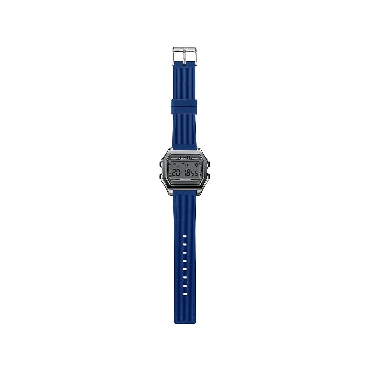 I AM men's digital watch with silver-colored metal-effect polycarbonate case with gray glass and blue silicone strap with steel buckle. Functions: Month, Date, Morning / Afternoon, Light, Ringtone, Stopwatch, Time Signal, 12/24 Hour Schedule. Water Resistance Is 5 Atm. Clock Equipped with J8519 Digital Movement. Clock Composed From Cash Ref. IAM-101 E Strap Ref. IAM-302.