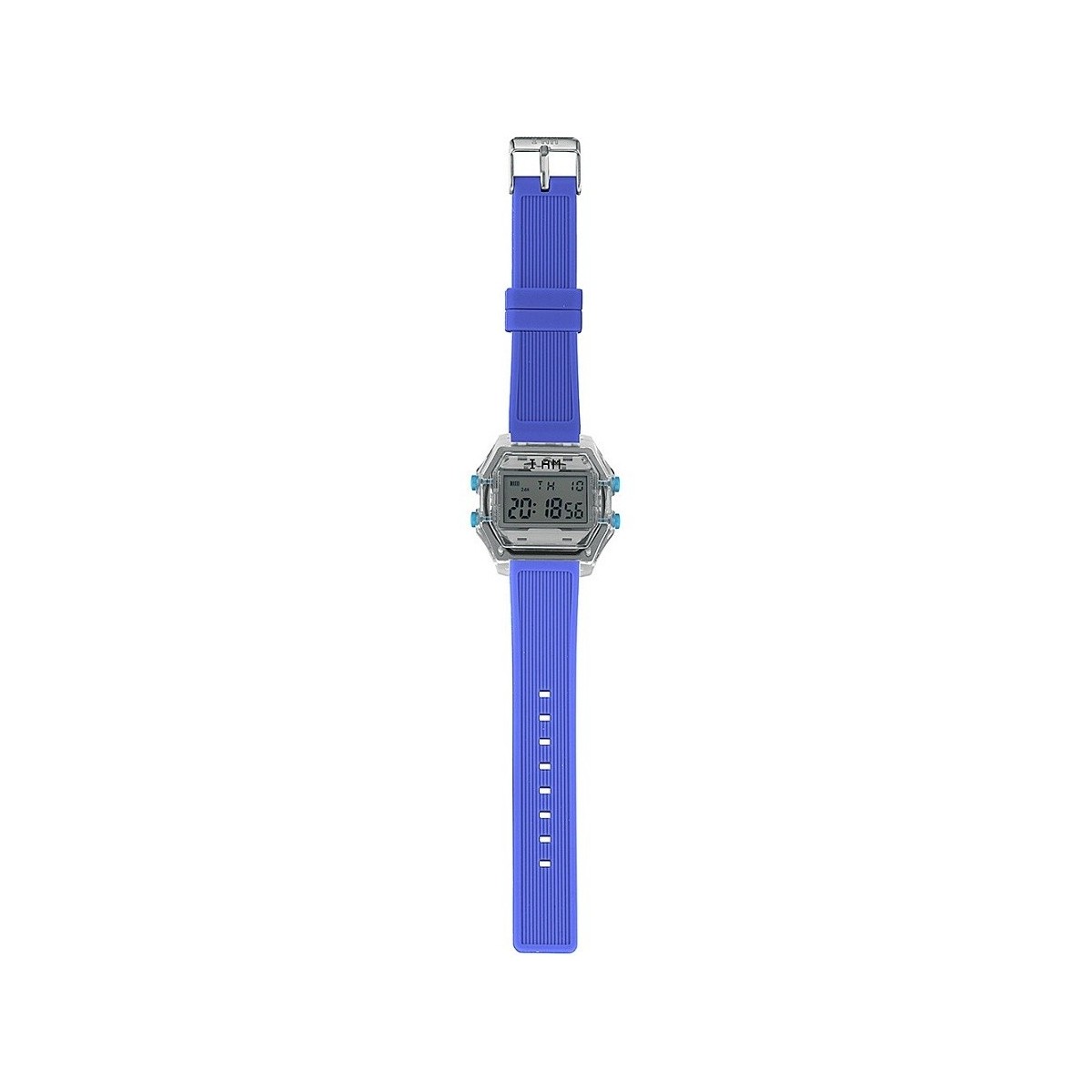 I AM men's digital watch with gray transparent polycarbonate case with gray glass and blue silicone strap with steel buckle. Functions: Month, Date, Morning / Afternoon, Light, Ringtone, Stopwatch, Time Signal, 12/24 Hour Schedule. Water Resistance Is 5 Atm. Clock Equipped with J8519 Digital Movement. Watch Composed From Cash Ref. IAM-110 E Strap Ref. IAM-306.