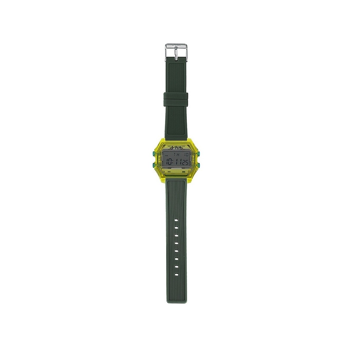 I AM men's digital watch with yellow transparent polycarbonate case with gray glass and dark green silicone strap with steel buckle. Functions: Month, Date, Morning / Afternoon, Light, Ringtone, Stopwatch, Time Signal, 12/24 Hour Schedule. Water Resistance Is 5 Atm. Clock Equipped with J8519 Digital Movement. Watch Composed From Cash Ref. IAM-109 E Strap Ref. IAM-310.