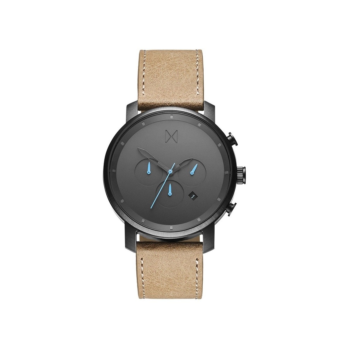 Gunmetal Sandstone model chrono man watch 45 mm with black PVD steel case, black dial with blue hands and beige leather strap