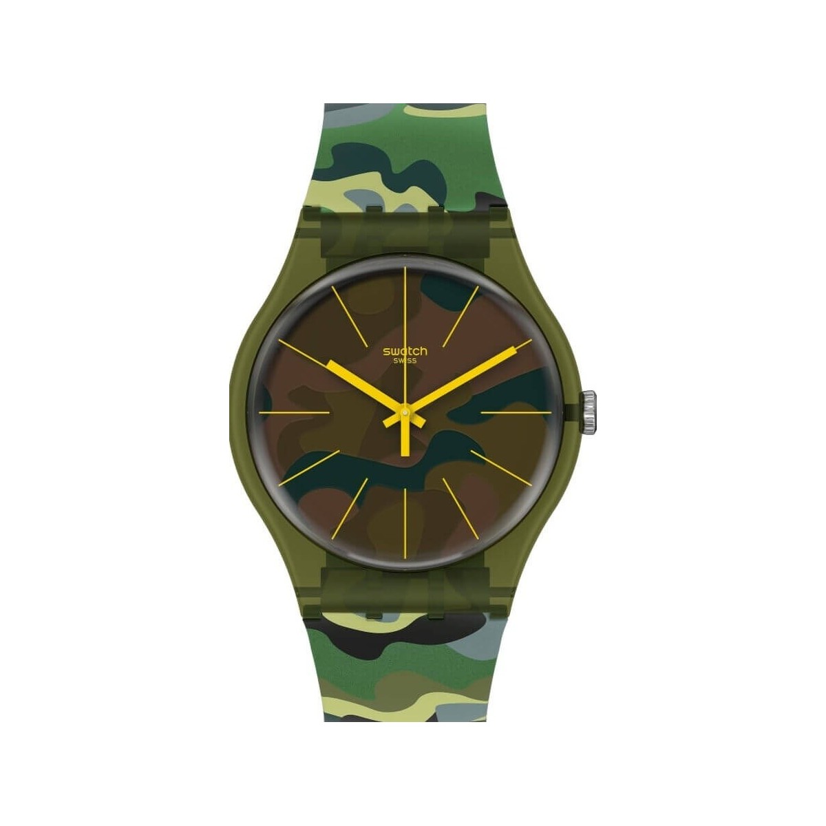 Watch man woman of the Summer Swatch Essentials collection with camouflage green strap, green plastic case, quartz movement.
