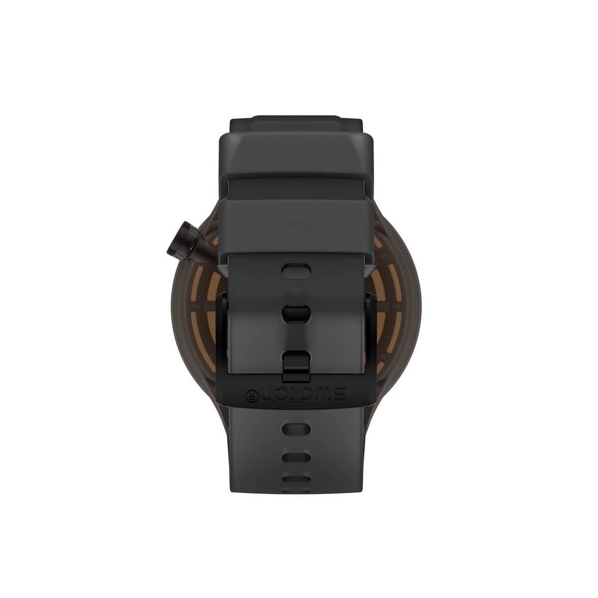 Swatch light taste watch from the Big Bold Standard collection with only time quartz movement, plastic case in semi-transparent black color with swatch solar spectrum gold effect and 47 mm round shape and silicone strap in semi-transparent black color