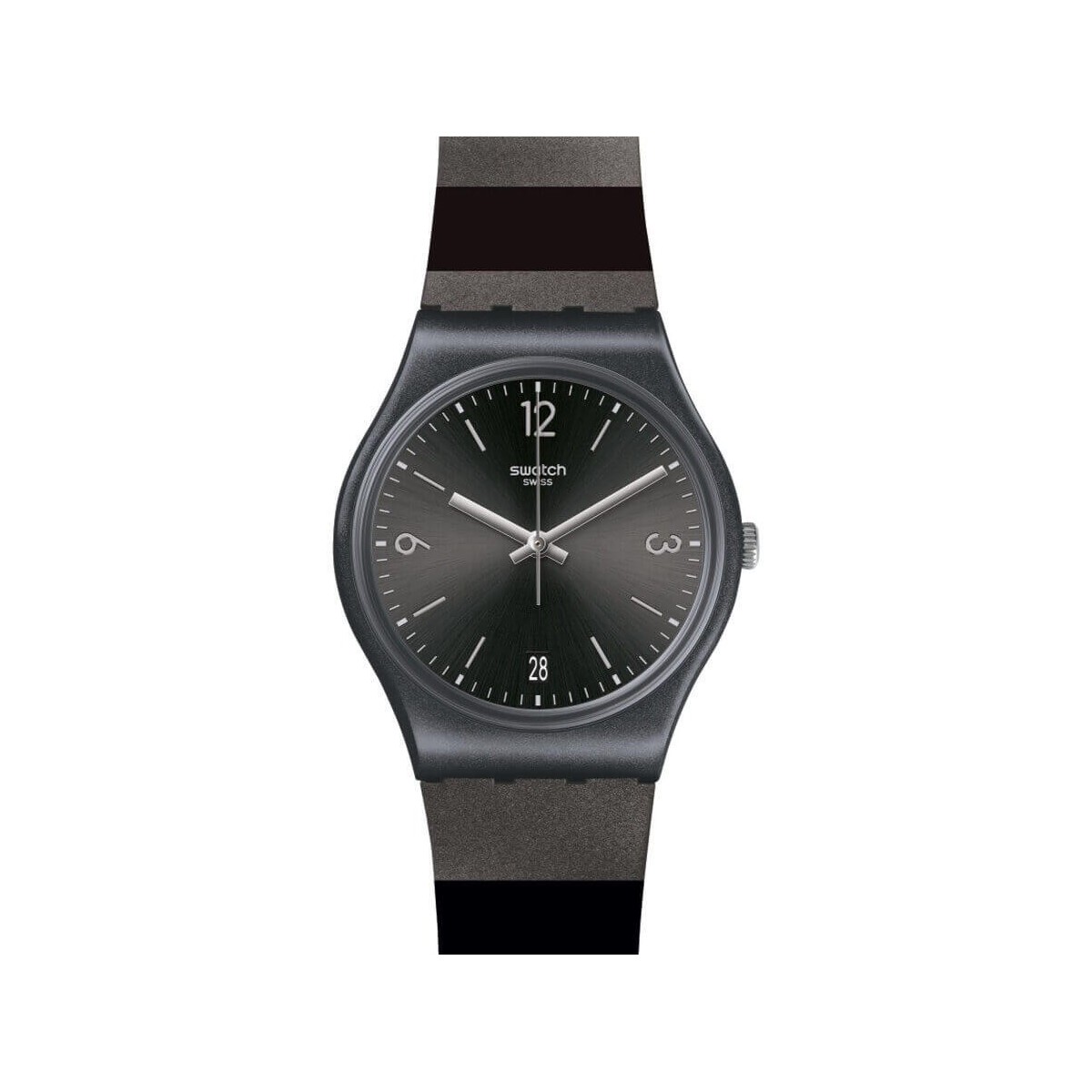 Swatch blackeralda watch from the Gent Standard collection with only time quartz movement, 34 mm round shaped black plastic case - anodized effect and black silicone strap with multicolored anodized effect print