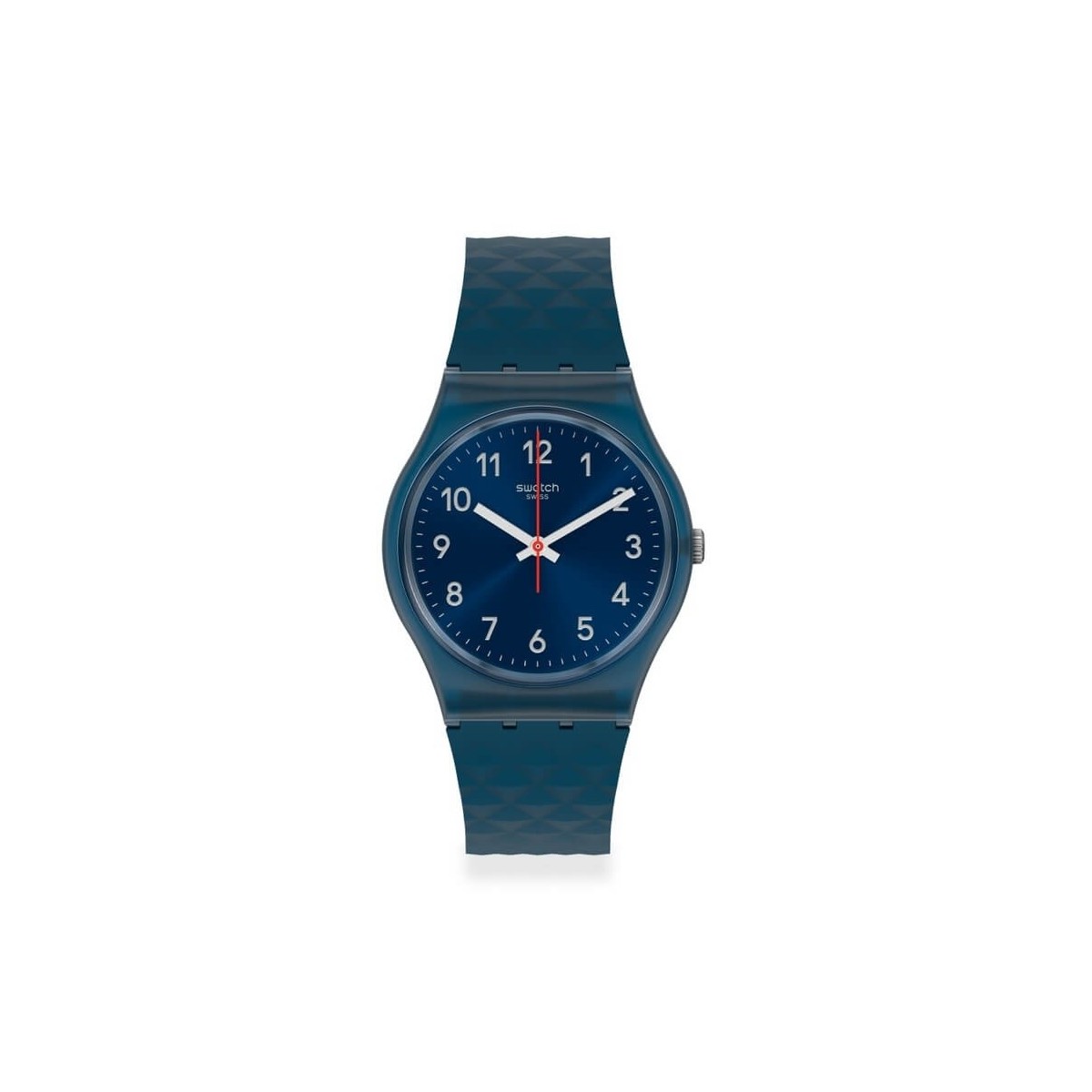 Swatch bluenel watch from the Gent Standard collection with quartz only time movement, 34 mm round-shaped transparent opaque blue plastic case and blue silicone strap