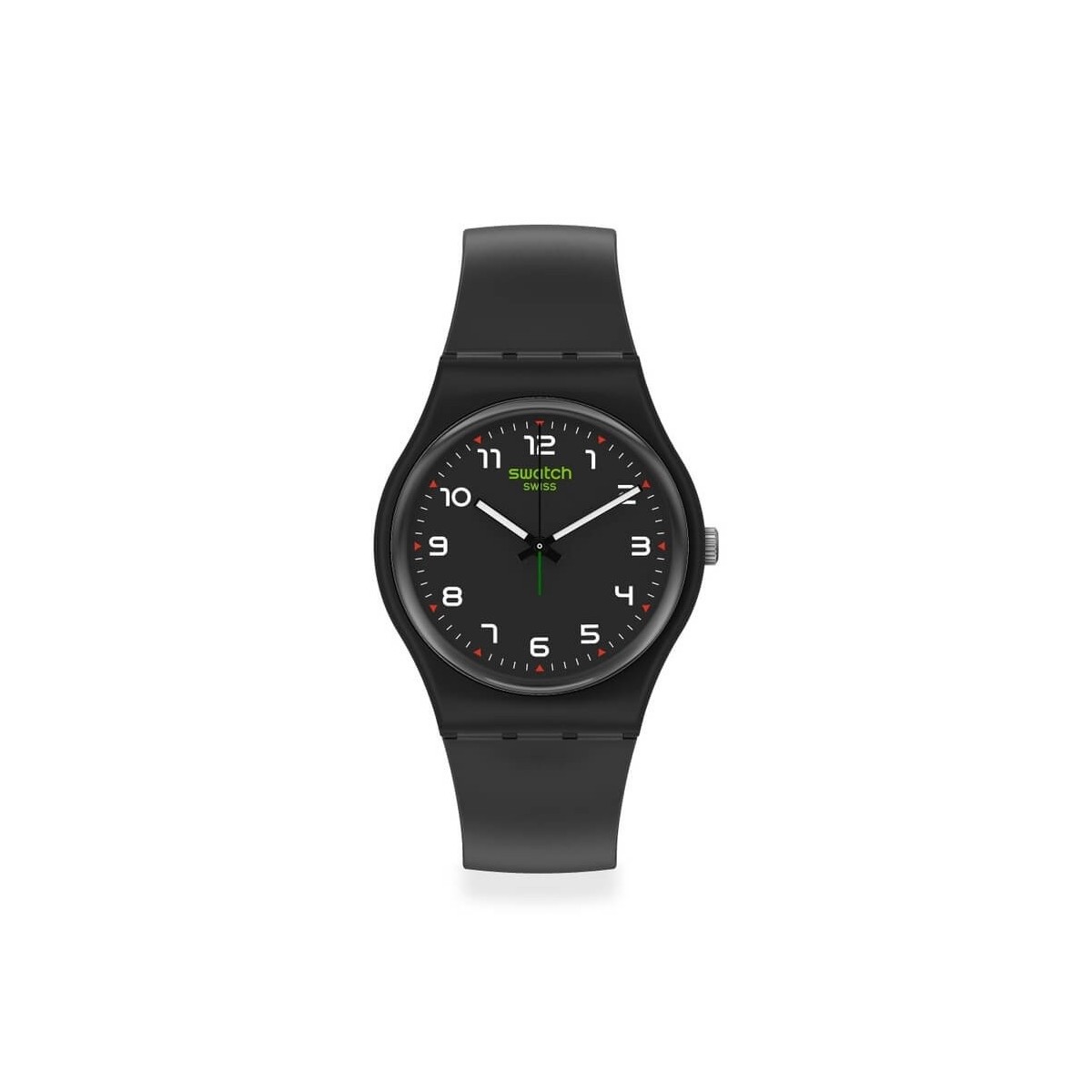 Swatch masa watch from the GENT 2 collection with quartz time only movement, 34 mm round shape in black organic plastic case and black biological soft plastic strap