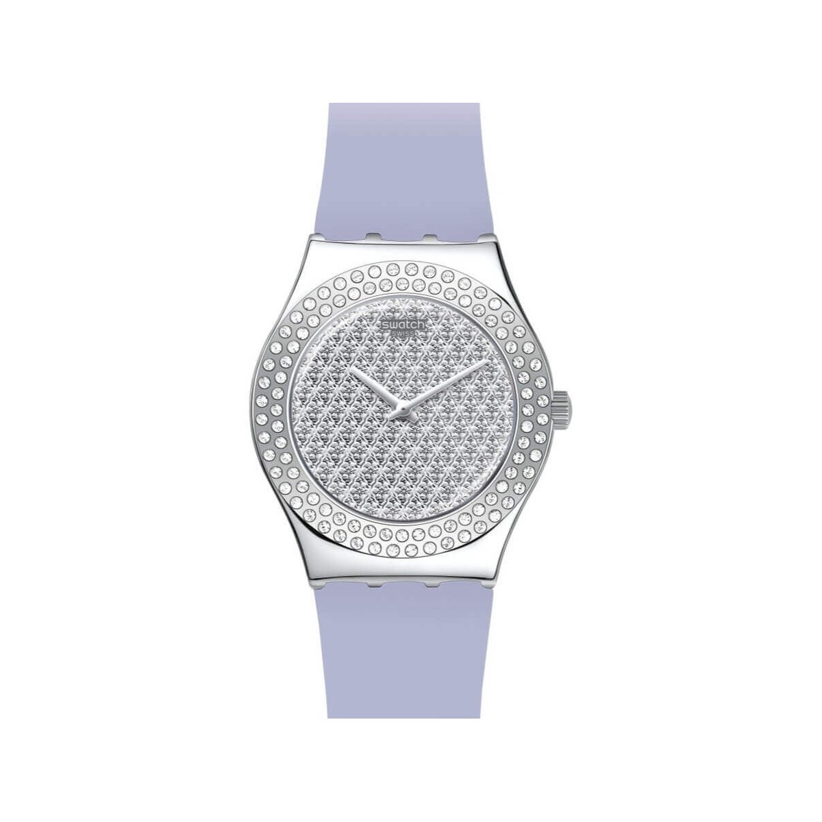Swatch lovely lilac watch from the I Medium Standard collection with only time quartz movement, silver-colored steel case and 33 mm round shape and purple silicone strap