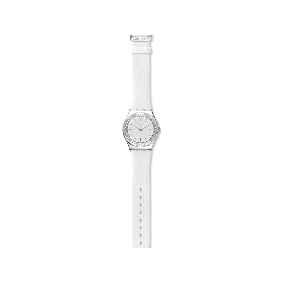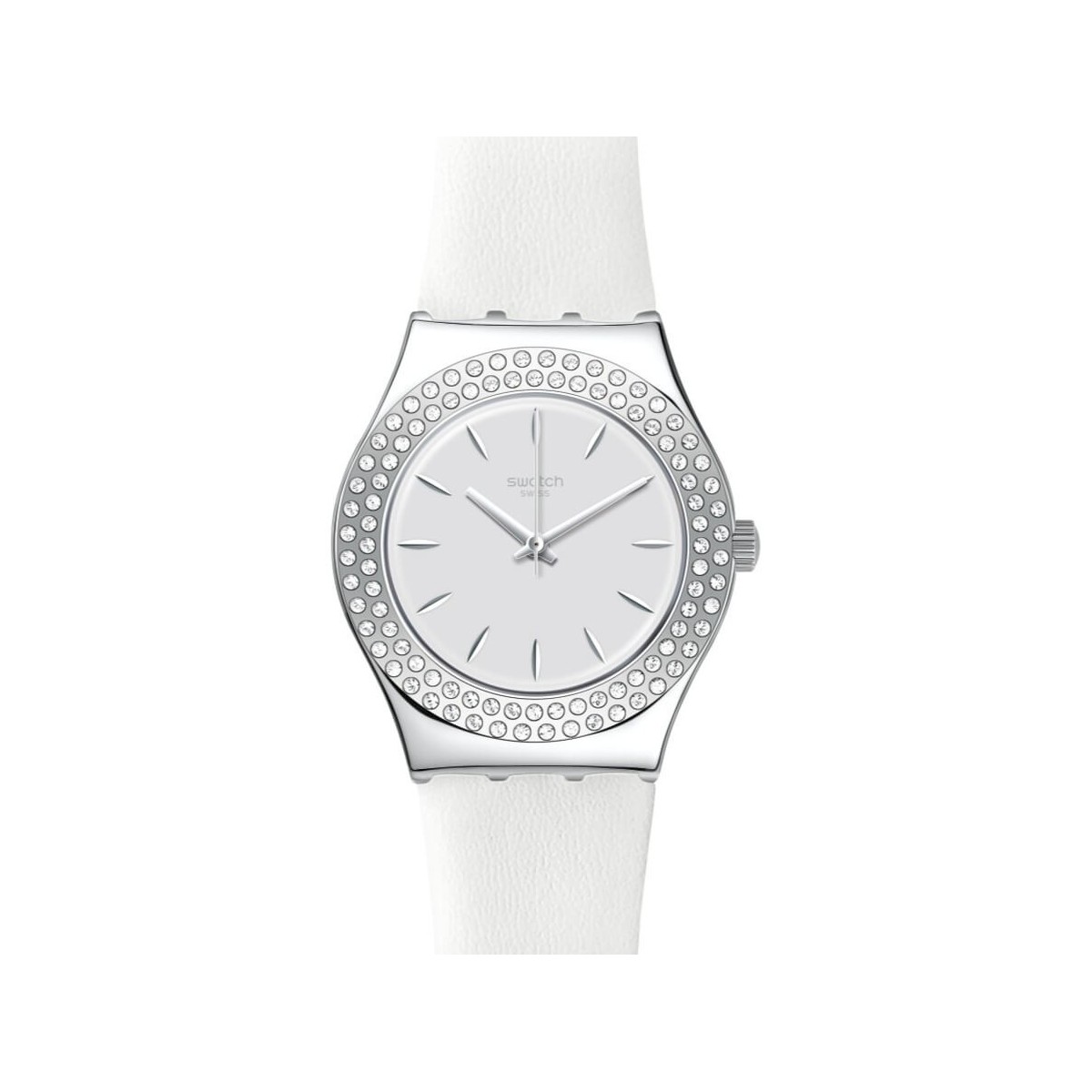 Swatch starry party watch from the I Medium Standard collection with quartz time only movement, silver colored steel case and 33 mm round shape and white leather strap