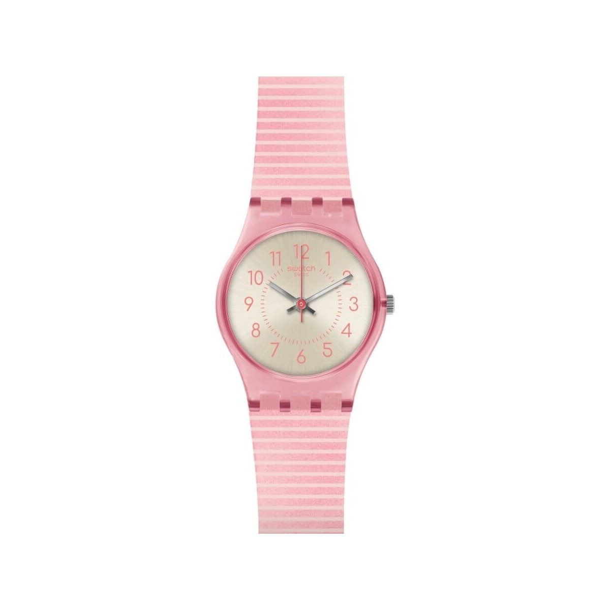 Swatch blush kissed watch from the Lady collection with only time quartz movement, transparent pink plastic case and 25 mm round shape and pink silicone strap with silver print - anodized effect