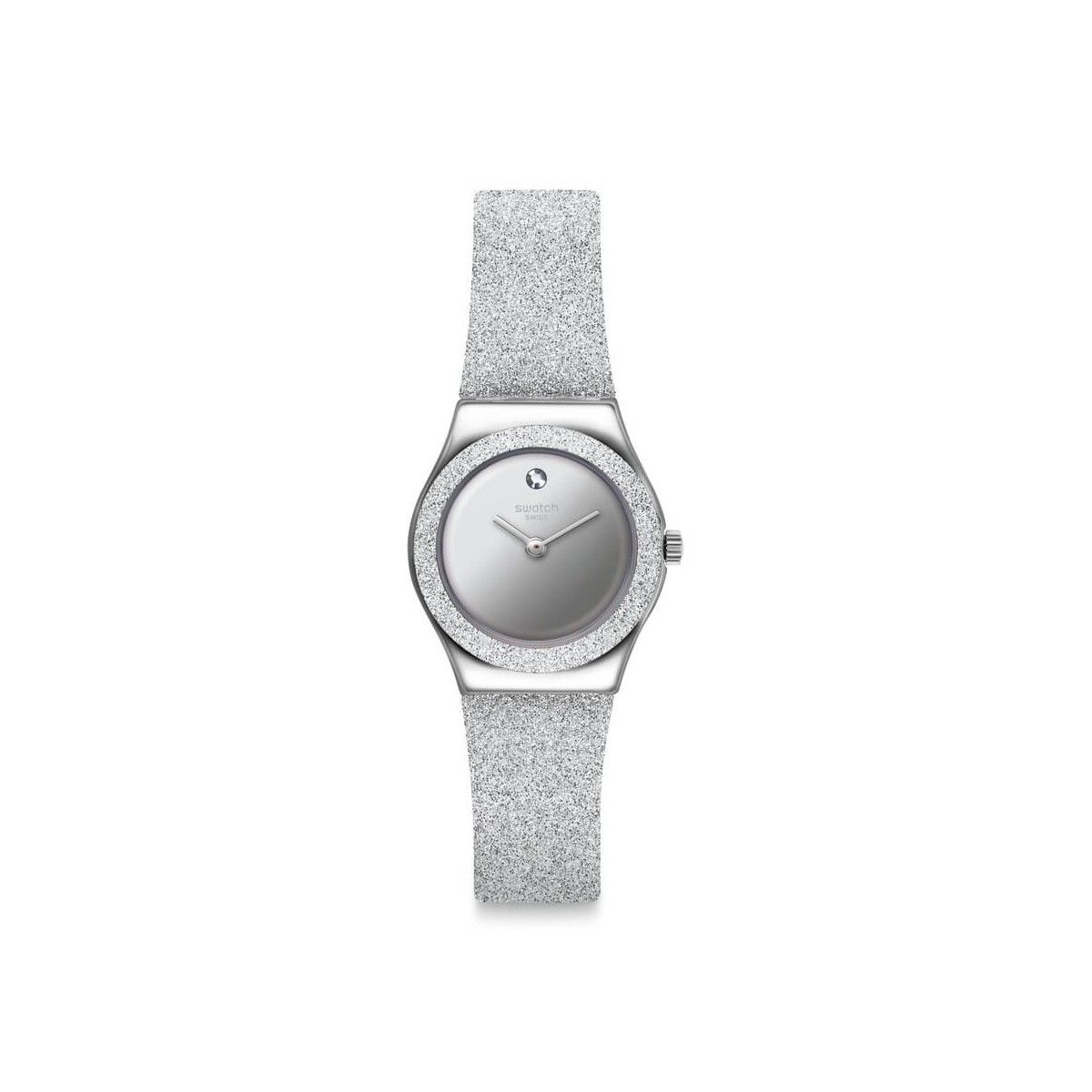 Swatch sideral gray watch from the I Lady collection with only time quartz movement, silver colored steel case and 25 mm round shape and silver leather and synthetic material strap with sparkling effect