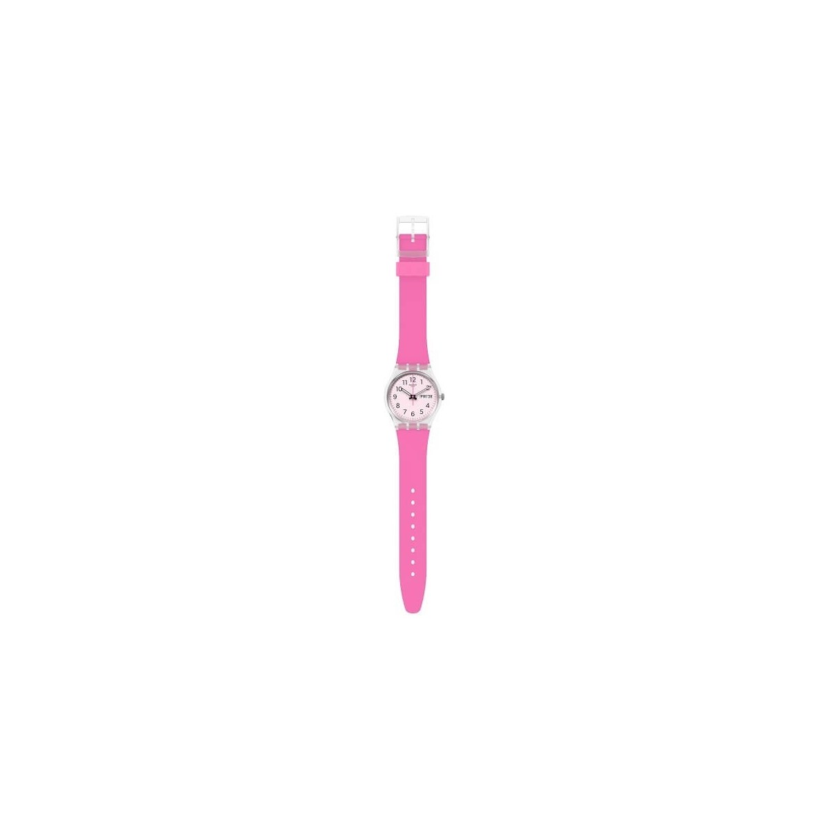 Swatch Rinse Repeat watch, from the Gent Monthly Drops collection, with round transparent plastic case with a diameter of 34 mm with pink dial, luminescent hands and strap in opaque pink biological material. Quartz movement.