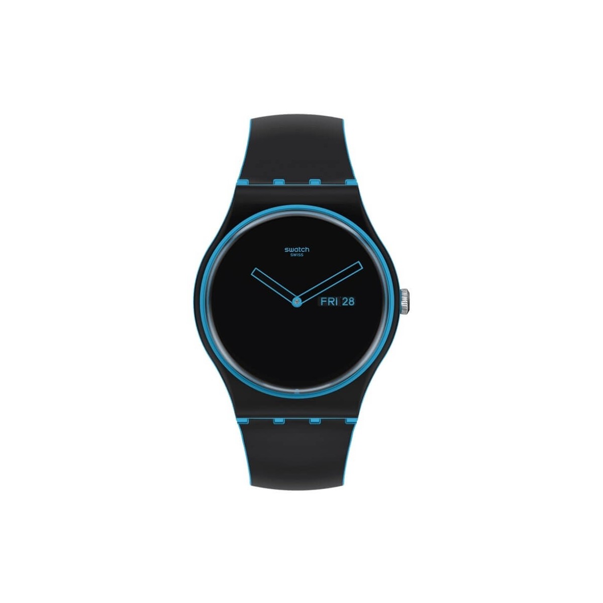 Swatch Minimal Line Blue watch, from the Monthly Drops collection, with time only function and quartz movement. The watch is characterized by a round case made with a material of biological origin with a diameter of 41 mm in blue, with a black dial and a black silicone strap. Peculiarities of this watch are the blue contour lines placed in contrast that give the watch a contemporary and minimal style. Buckle closure.