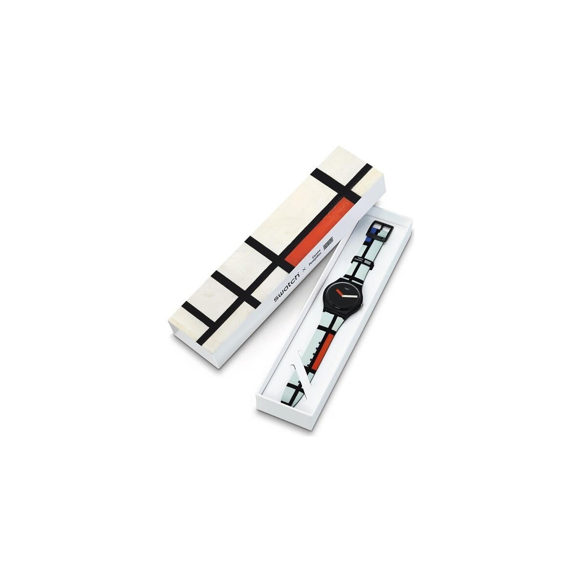Swatch New Gent watch with time only function and quartz movement. From a collaboration with the Center Pompidou museum, this clock is born which celebrates Piet Mondrian's most famous painting "Composition en Rouge, Bleu et Blanc II". Watch made from matt black silicone strap with complete print of the painting, 41 mm case with black dial that acts as a background to the red and white hands.