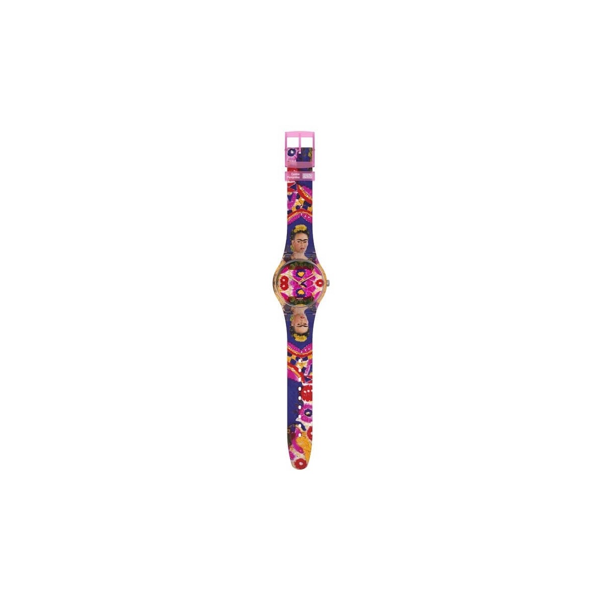 Swatch New Gent watch with time only function and quartz movement. From a collaboration with the Center Pompidou museum comes this clock that celebrates the famous painting by Frida Khalo "El Marco". Watch composed of a semi-transparent matte pink silicone strap with a complete print of the painting that also extends onto the dial, recalling the cheerful colors of Mexico and its folkloristic reality, to complete the look there is the 41 mm case and the matte pink buckle.