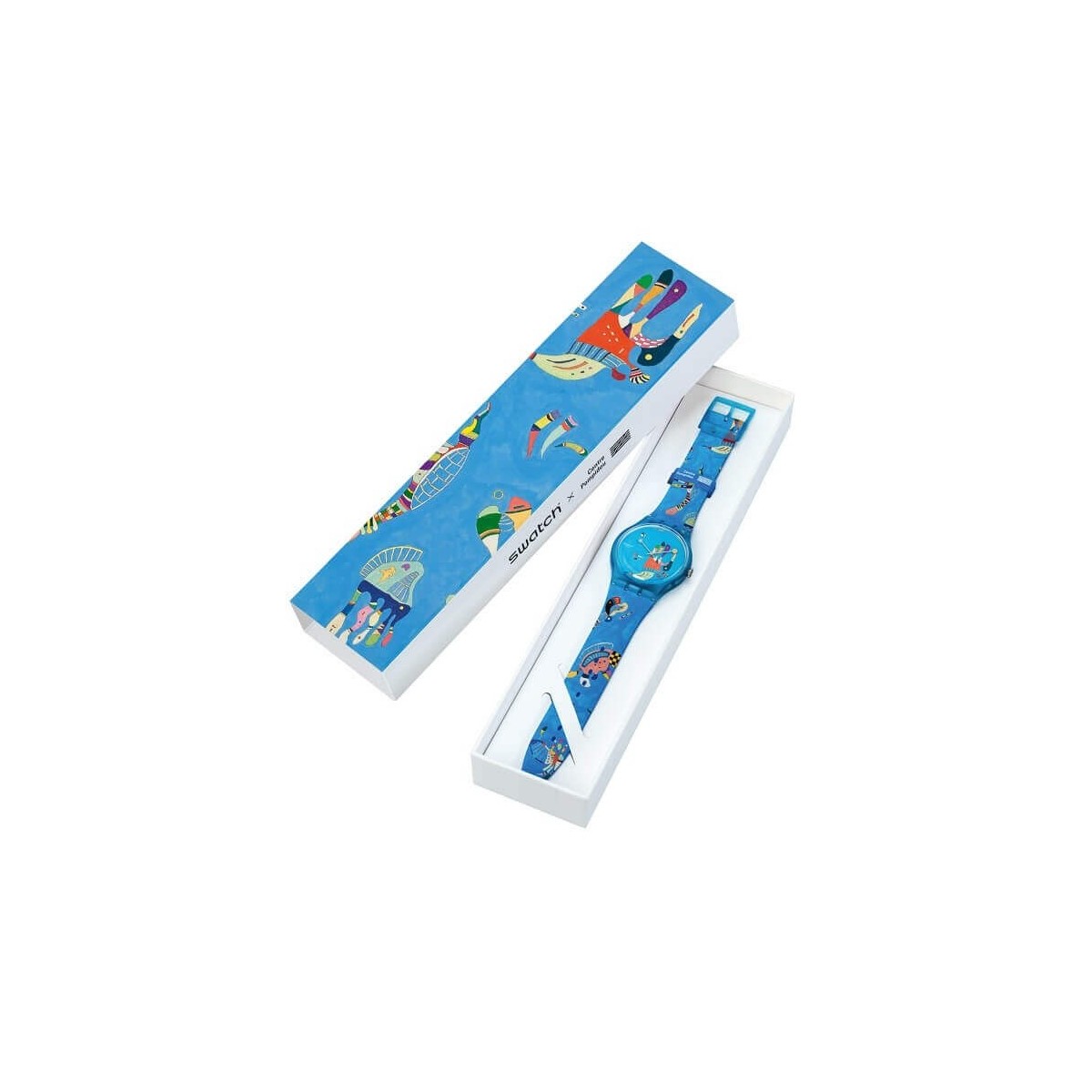 Swatch New Gent watch with time only function and quartz movement. From a collaboration with the Center Pompidou museum comes this clock that celebrates the famous painting by Vassily Kandisky "Bleu De Ciel". Watch composed of a matte blue silicone strap with a complete print of the painting that also extends onto the dial taking up the cheerful colors of Kandisky, to complete the look there is the 41 mm case and the hands inspired by the author and his works.