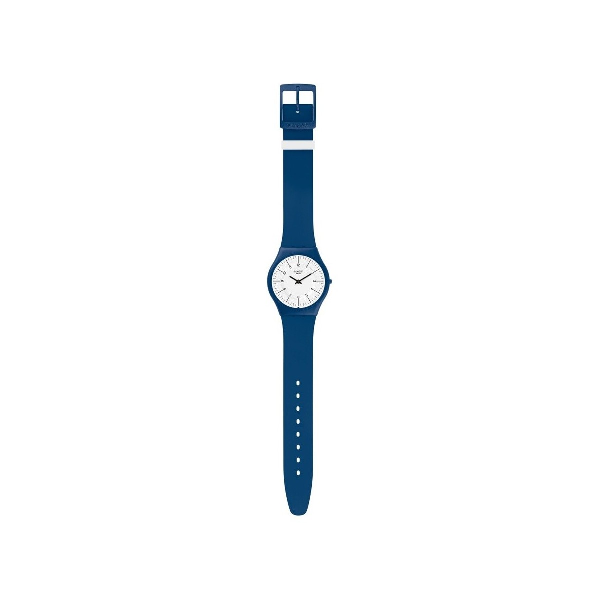 Swatch marmarella watch from the Skin collection with only time quartz movement, blue plastic case and 34 mm round shape and blue silicone strap