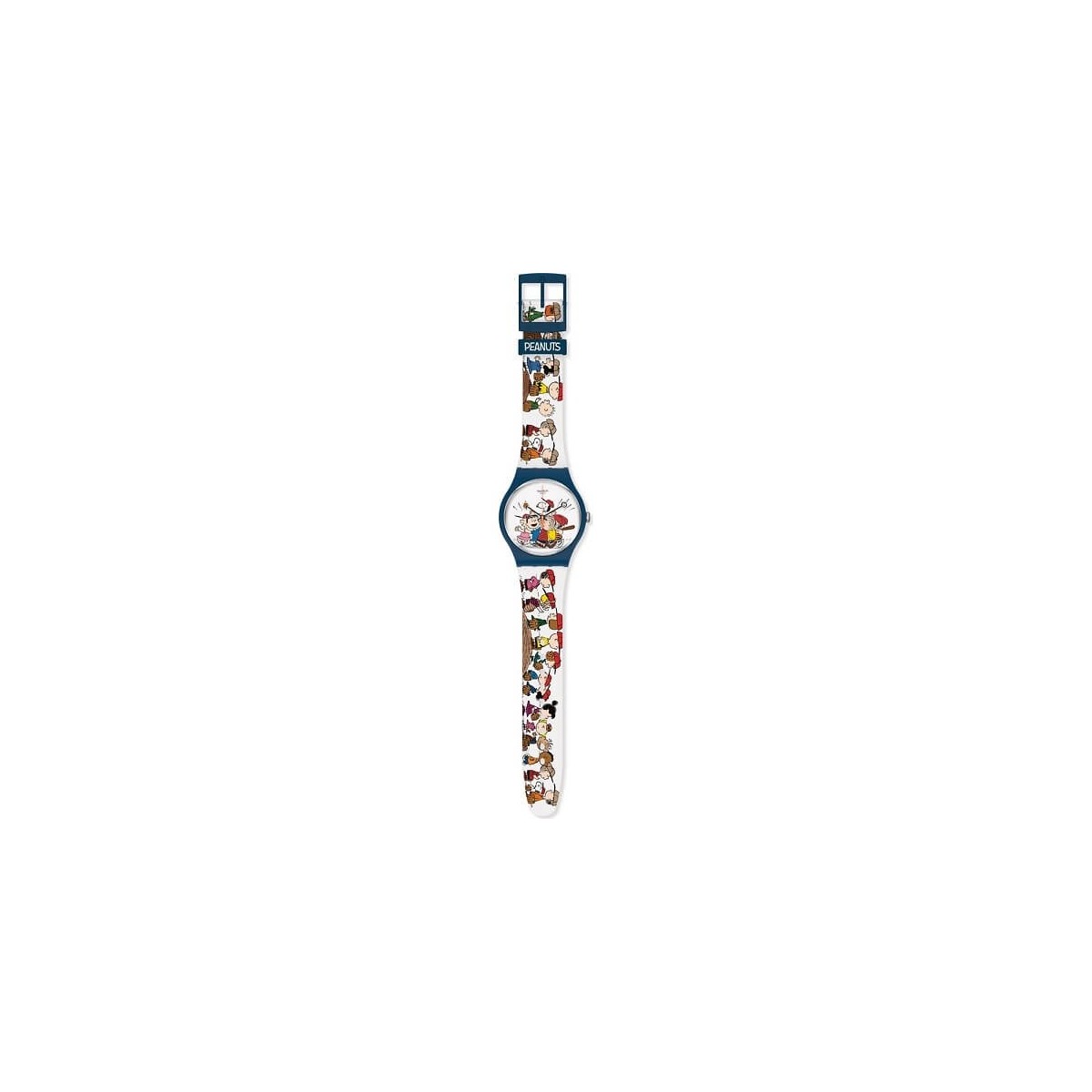 Unisex watch, Peanuts line, only quartz time. White silicone strap with Peanuts band print, also used on the dial. Case made with 41 mm biological material and blue color.