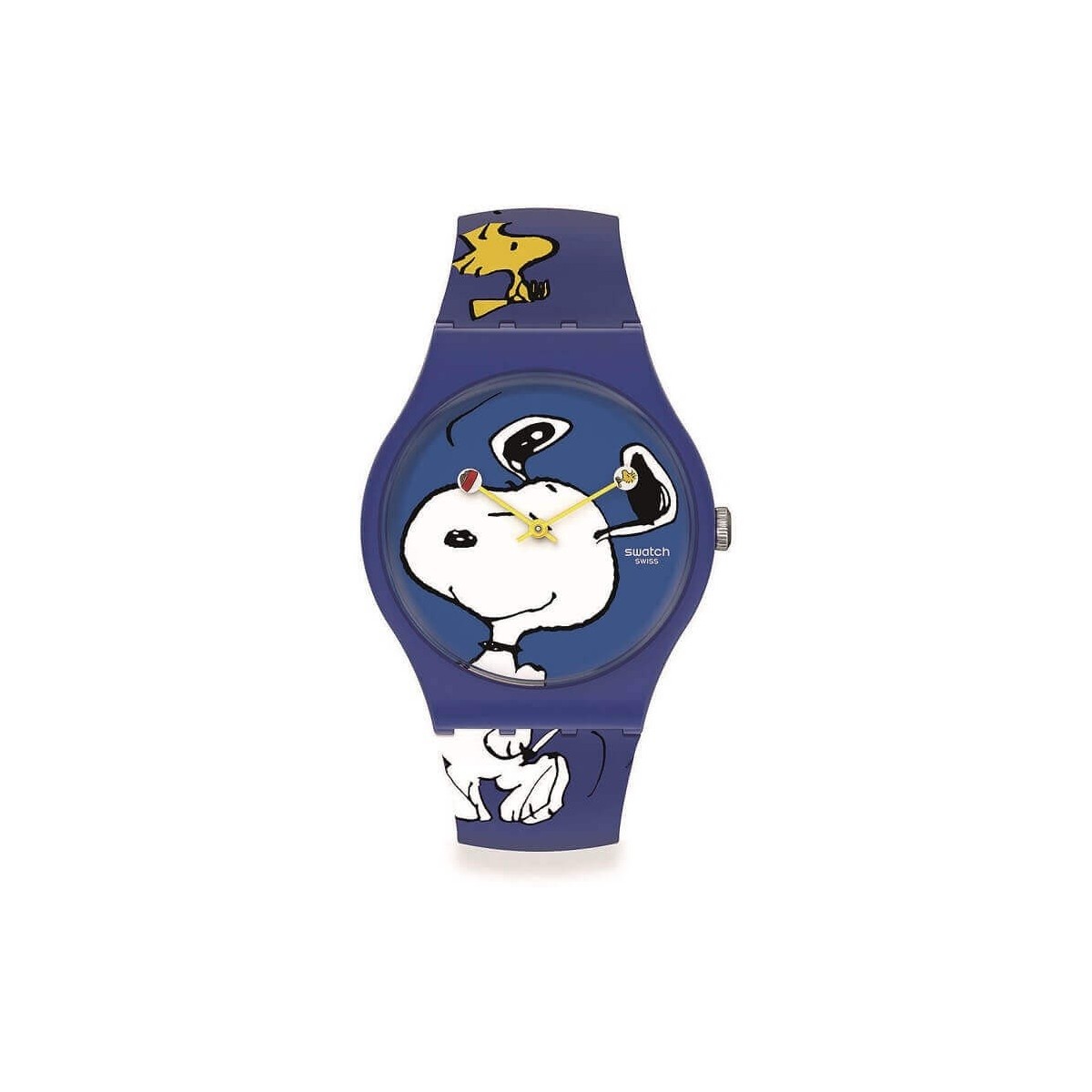 New Gent Swatch X Peanuts blue watch with Snoopy and Woodstock
