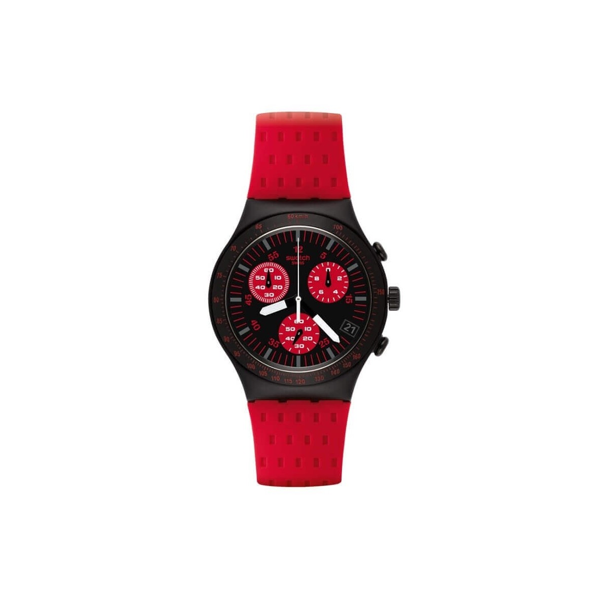 Orologio Swatch, della collezione Iriny Chrono modello Redly, con funzione di cronografo con movimento al quarzo. L'orologio presenta un simpatico e giovanile cinturino in silicone di colore rosso, con chiusura a fibbia in alluminio, cassa grande di colore nero, quadrante nero con lancette bianche e numeri rossi.