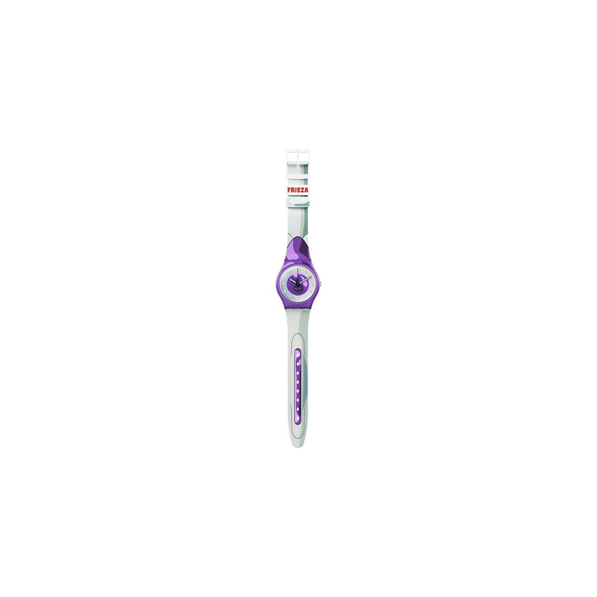 Swatch watch, from the Dragon Ball Z collection, with time only function and quartz movement. The watch features a cute and youthful white silicone strap with a multicolor print, white plastic buckle closure, medium white case with a multicolor print, on the white and purple dial simulates Frieza's characteristic physique.