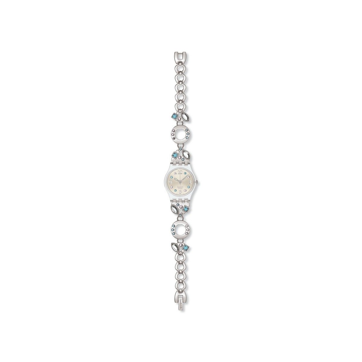 Swatch menthol tone watch from the Lady collection with quartz time-only movement, 25 mm transparent and round-shaped plastic case and multicolor steel strap