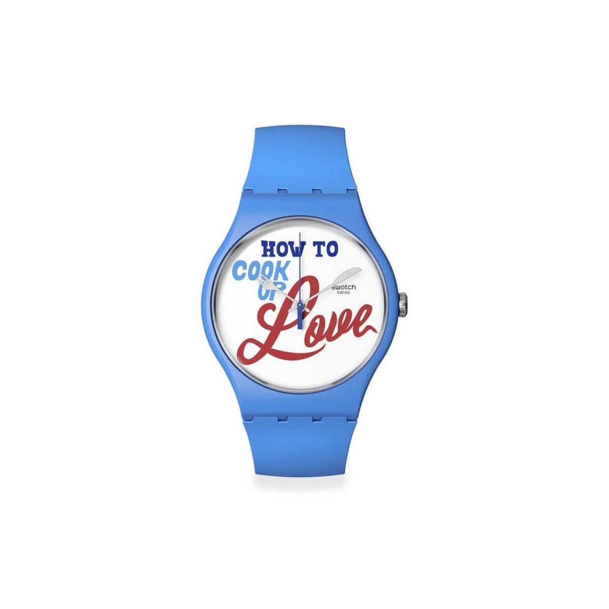 Unisex watch, Recipe For Love line, quartz time only. Blue silicone strap, 41 mm case and Love motif dial. Interchangeable loops for every ingredient of love