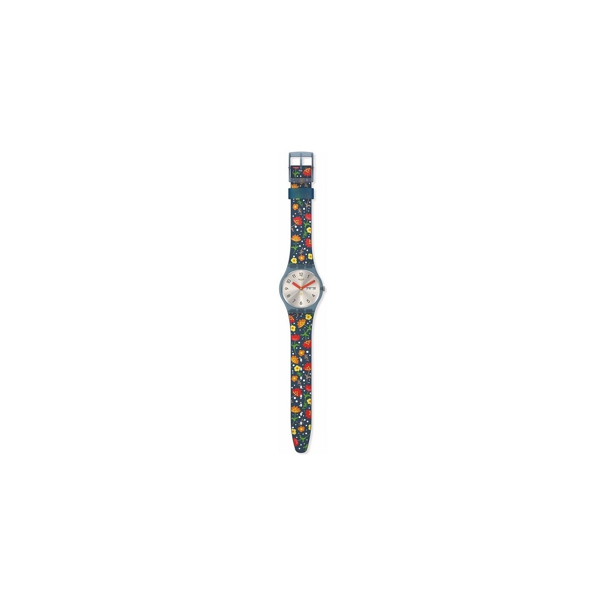 Swatch Essence of Flower watch from the Swatch Gent The March collection, features a strap printed with floral motifs and a semi-transparent case, in an opaque light blue color, in organic origin material. The dial is brushed gray, with red and yellow colored hands. Month and day at 3 o'clock. Quartz movement.